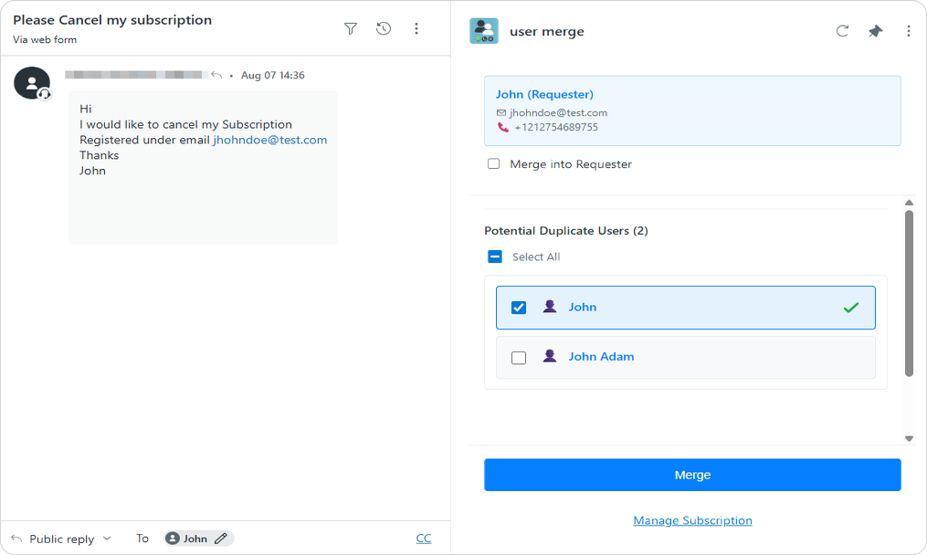 Save time and maintain clean, unified user data with our app. The Advanced End User Merge app detects potential duplicates in the ticket sidebar, allowing agents to merge them with one click.