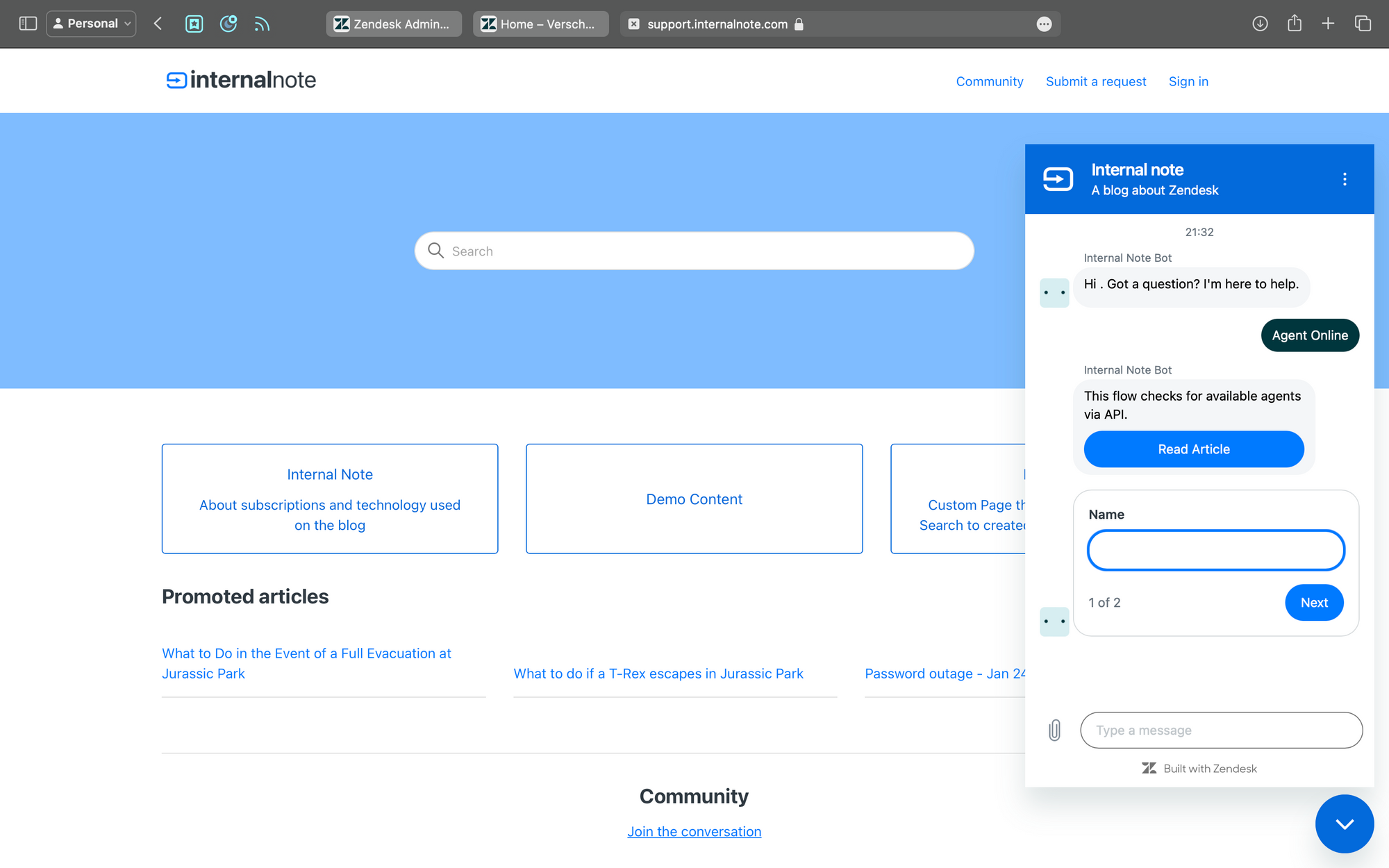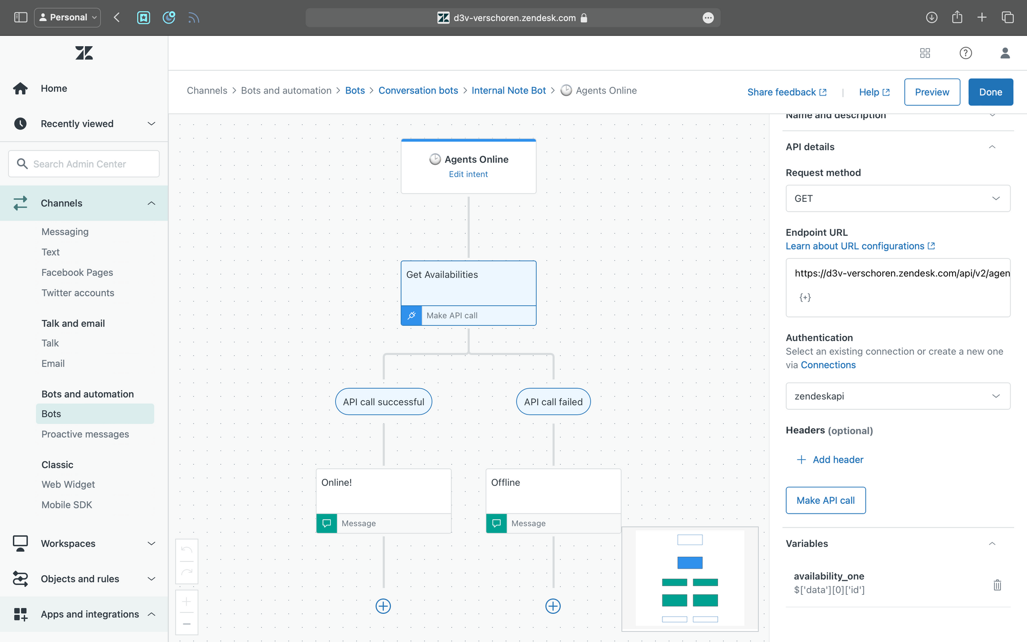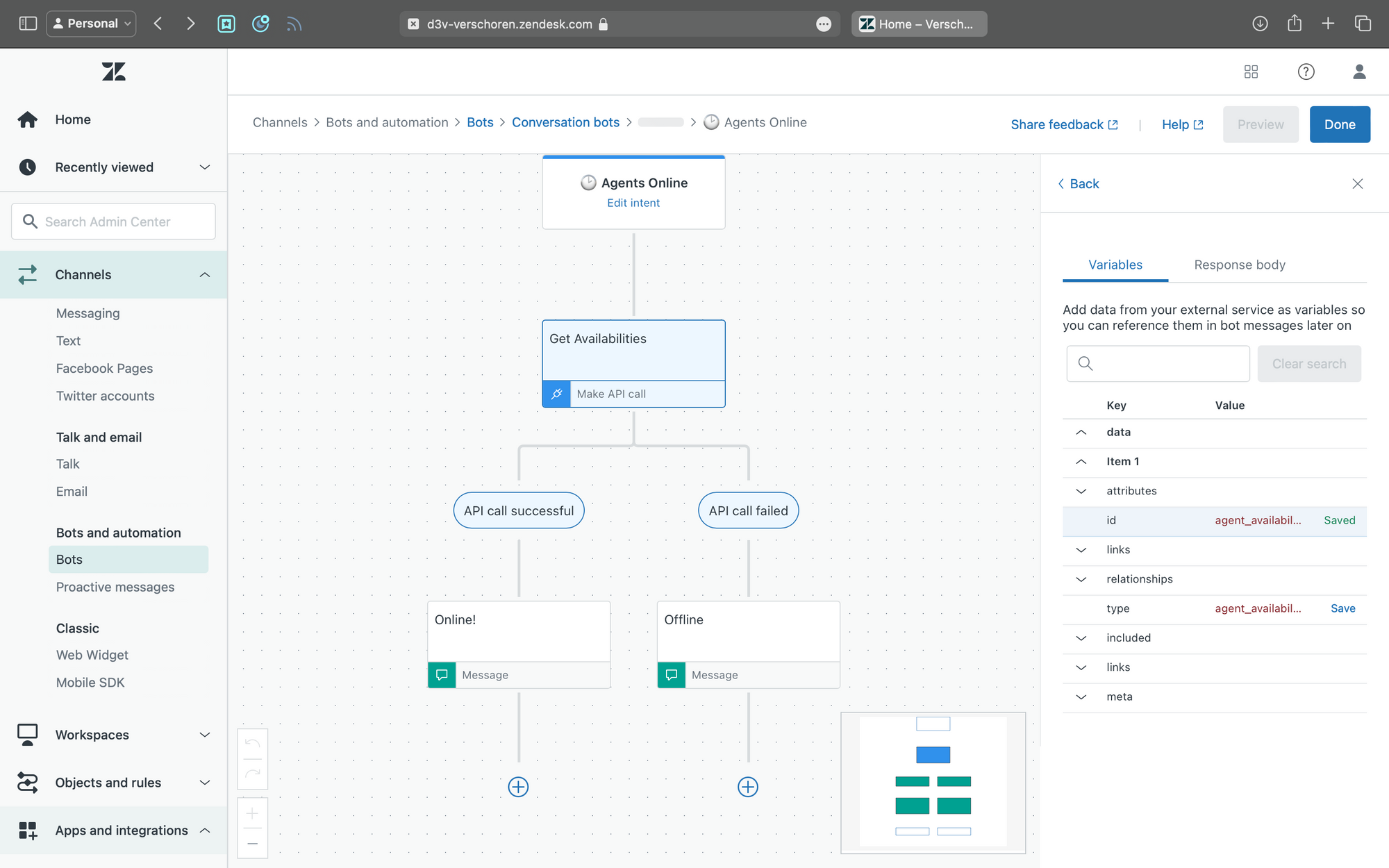 Now that we know how we can retrieve agent availability, we can use this in a Zendesk Bot to let customers know if someone is available to assist, or if they can leave a message.