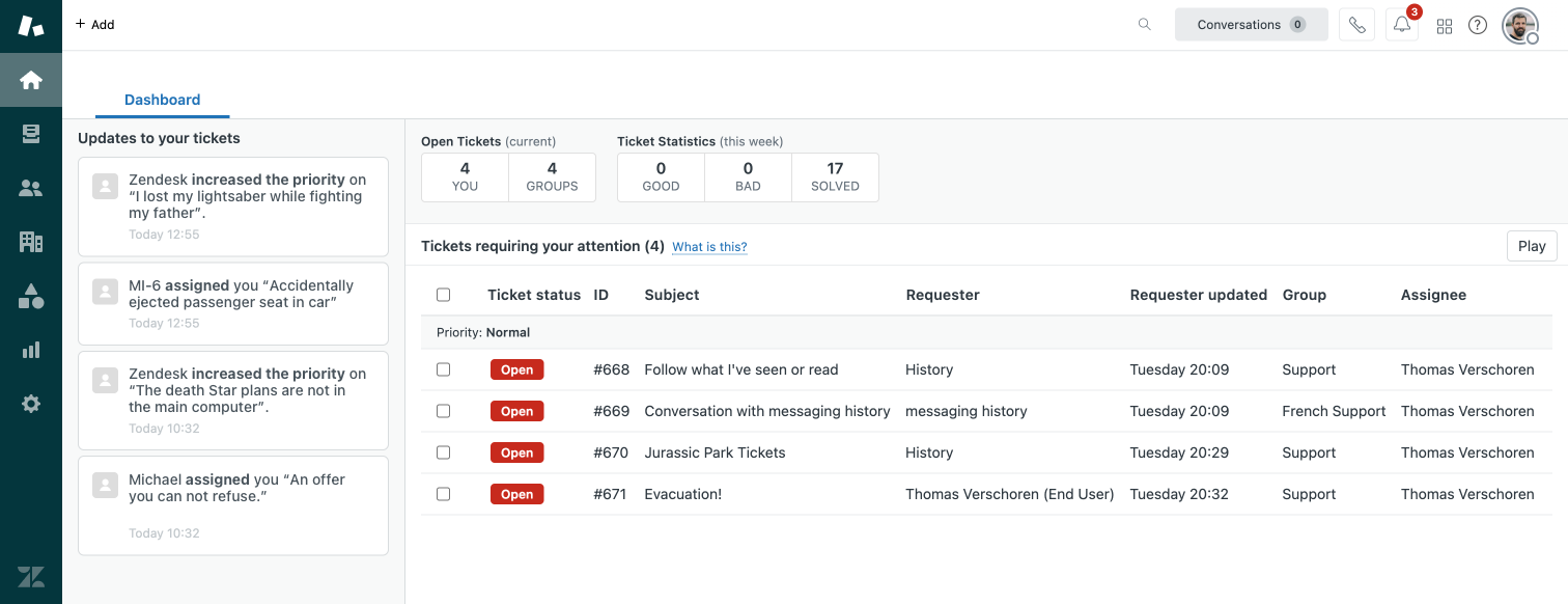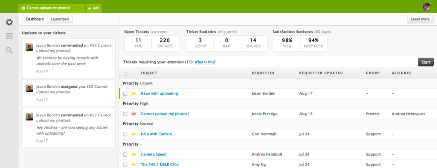 But there's one spot in Zendesk that's always been a big head-scratcher for me: the Agent Dashboard. It's the first element in the Agent Workspace navigation and it's a place I seldom use. The Dashboard contains a random list of priority sorted tickets, and a list of updates and wraps up with a list of stats.