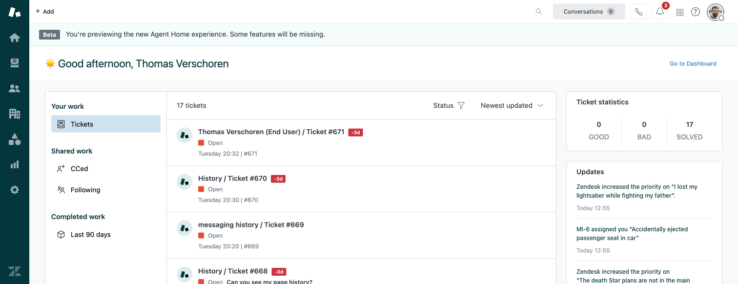 A few weeks ago one of the product managers at Zendesk reached out to me to show a new concept they were working on and ask for some initial feedback. That concept turned out to be the new Agent Home. I had already seen some earlier versions of this new idea in slide decks, but apparently the new Agent Home was not only almost ready, but the beta was launched a few weeks later.