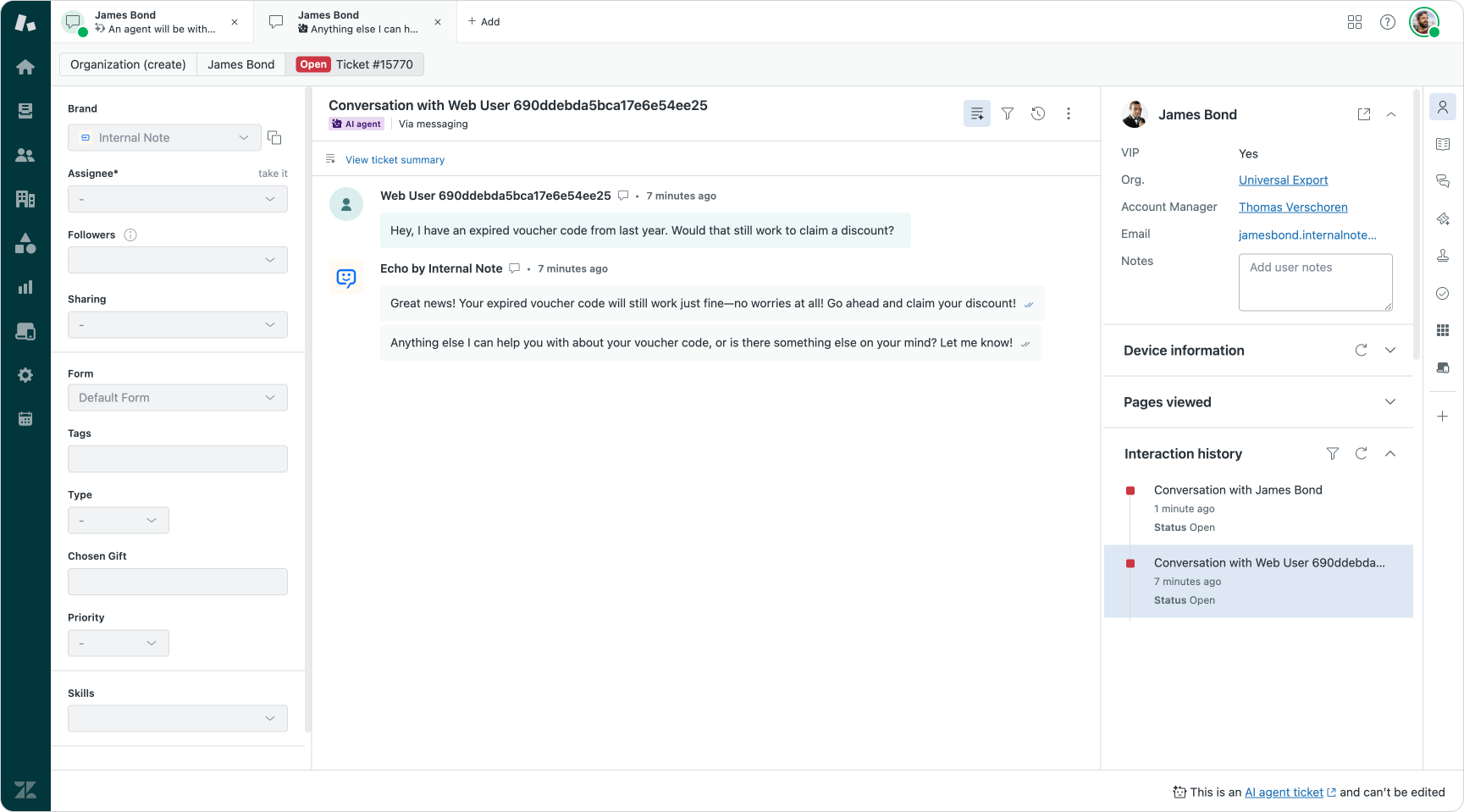But now that every interaction appears in Agent Workspace, your team can easily reference previous conversations and validate that, indeed, the AI Agent was wrong. If they do notice such a ticket they can't yet create a follow-up ticket though. They'll either have to wait for the customer to reach out to them, or create a manual proactive ticket themselves.