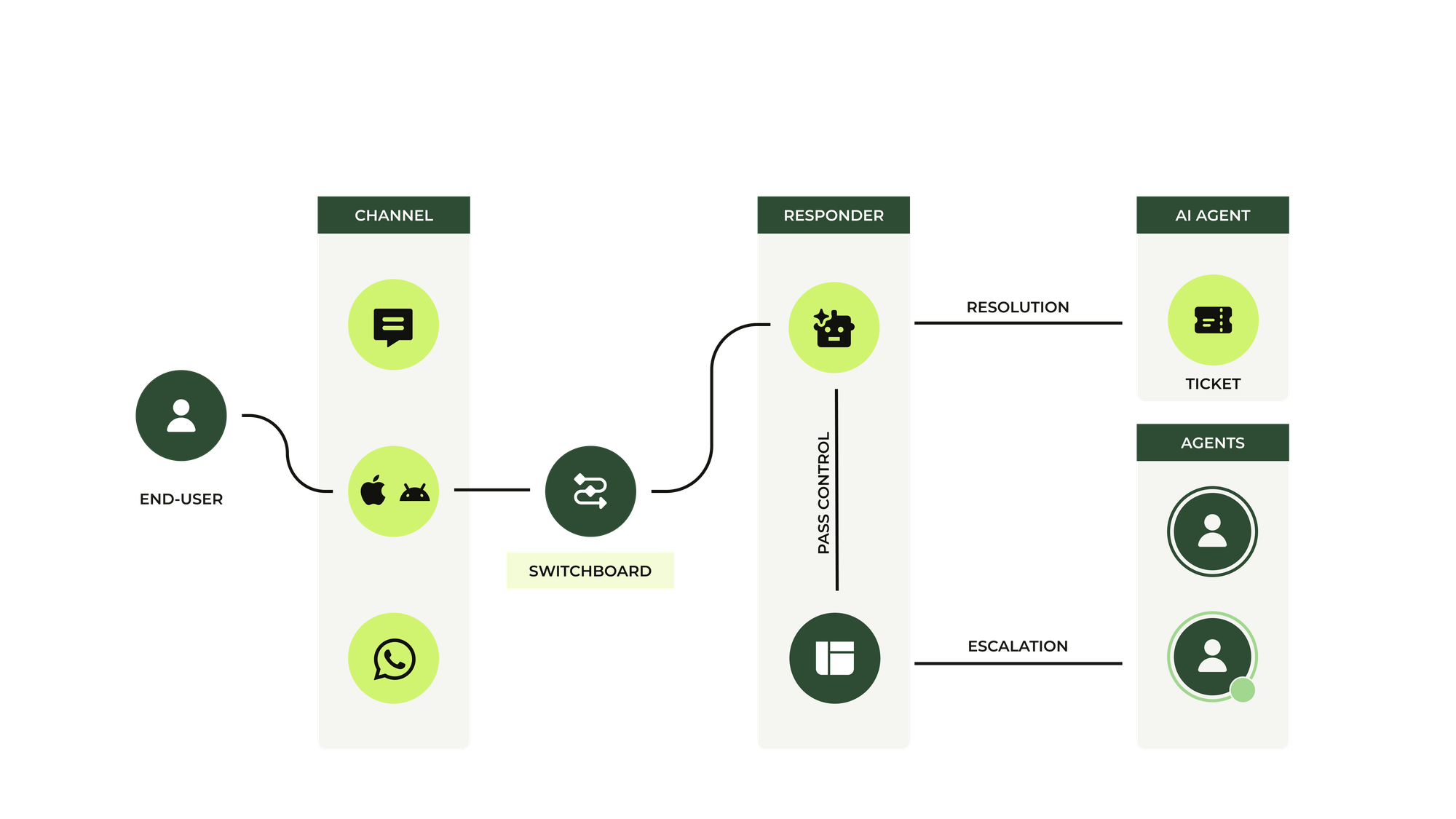 If the AI Agent is capable of handling the conversation on its own, this results in a conversation being stored in SunCo. If however the AI is instructed to escalate the conversation to a human agent, the Switchboard will pass control to the next responder, Agent Workspace. This pass control triggers the creation of a ticket, which can then be picked up by a human agent.