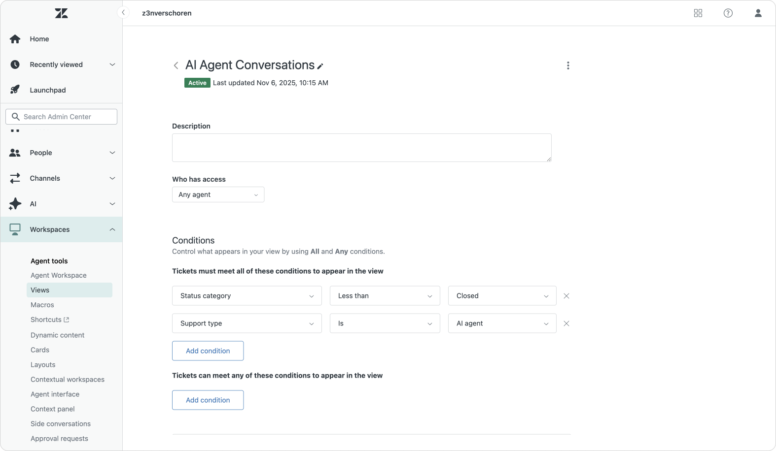 In my intro, I described this release as proactive — and that’s exactly what it was. Zendesk anticipated how the rollout might affect existing workflows and ensured that Agent Home and Views behaved as expected. While traditional Views that list open tickets could have shown AI Agent conversations, Zendesk deployed this feature such that they only show human-handled support tickets by default.