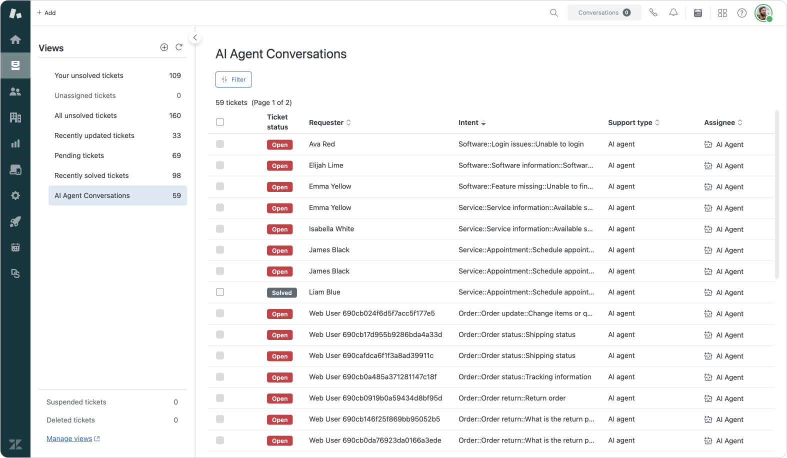AI Agent tickets appear in an open state in your instance and remain that way unless the AI Agent passes control, the conversation is resolved or the conversation turns inactive. When a pass control happens these tickets are converted to regular tickets and react just like they always did. In all other scenarios the ticket will be moved to a solved state.