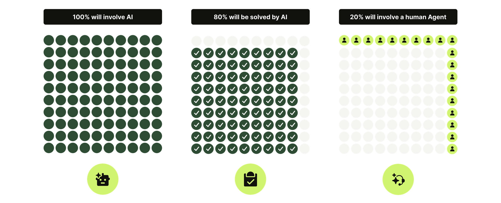 But with the arrival of AI Agents that context changed. Where previously all tickets reached your human agents, now more and more conversations have the potential to be resolved by an AI Agent. These conversations don't need your team anymore and are handled autonomously by the AI Agent. And as the capabilities of AI Agents increase, Zendesk even predicts that up to 80% of tickets will be resolved by AI, with the remaining 20% being handled by humans assisted by AI.