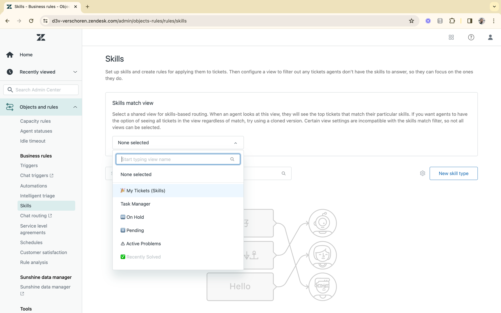 Once you've setup your skills, you need to select a View which will show the agent their Skill-matched tickets. Since tickets are routed and assigned to agents, this view is not really a requirement when using Omnichannel Routing, but it could give agents insight in how many active tickets pertaining to their skills there are across all agents. I recommend making a copy of your "My Tickets" view and using that one.