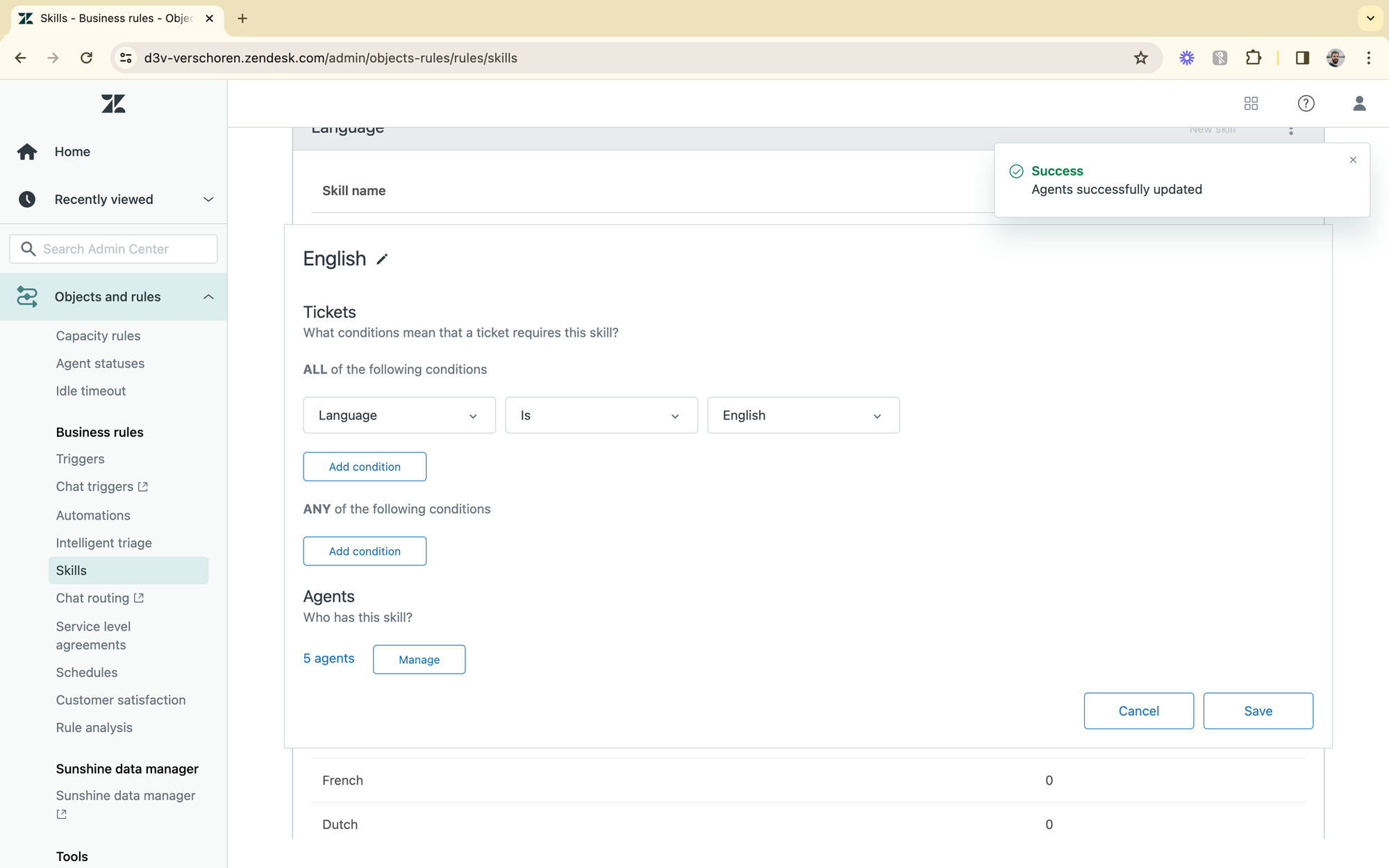 - For each skill, setup the conditions. These work similar to how you setup triggers or views: e.g. Language is Dutch. Or "Country is Belgium" or "Country is Netherlands"