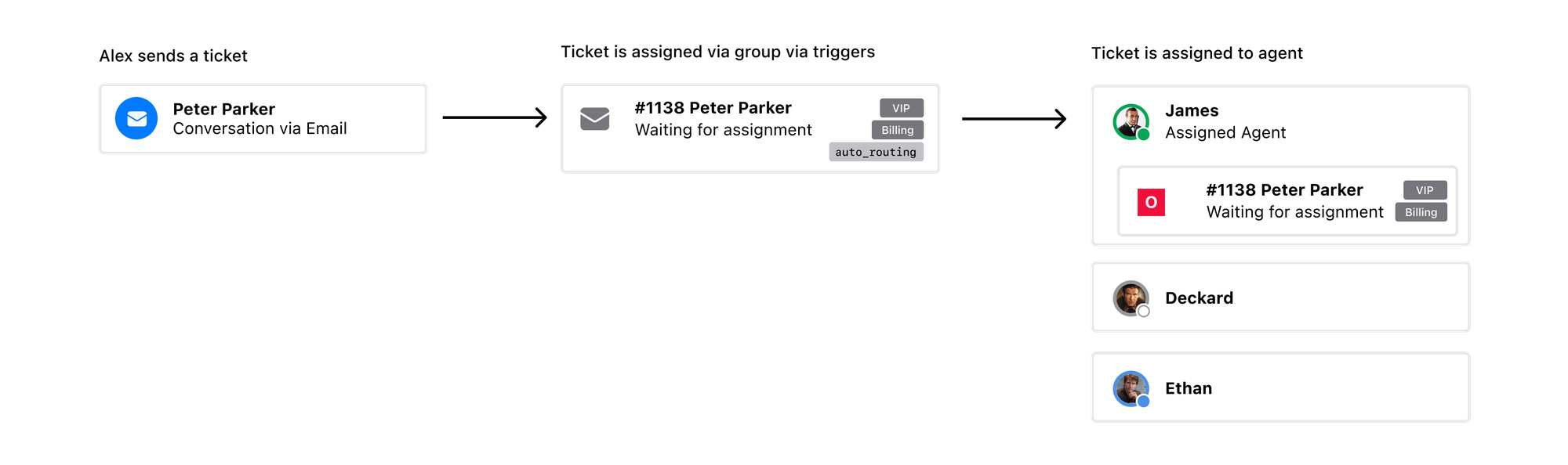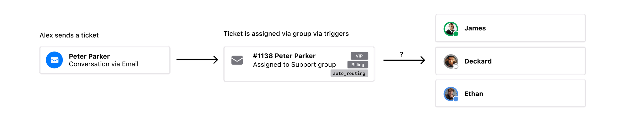 Forgetting groups, triggers and views for a moment, what we want is to make sure that if a ticket is raised, that we assign that ticket to the best agent to handle that ticket. Best can mean, the agent that is online, it can mean the agent that knows about the topic, or it can be the agent already working on that ticket.
