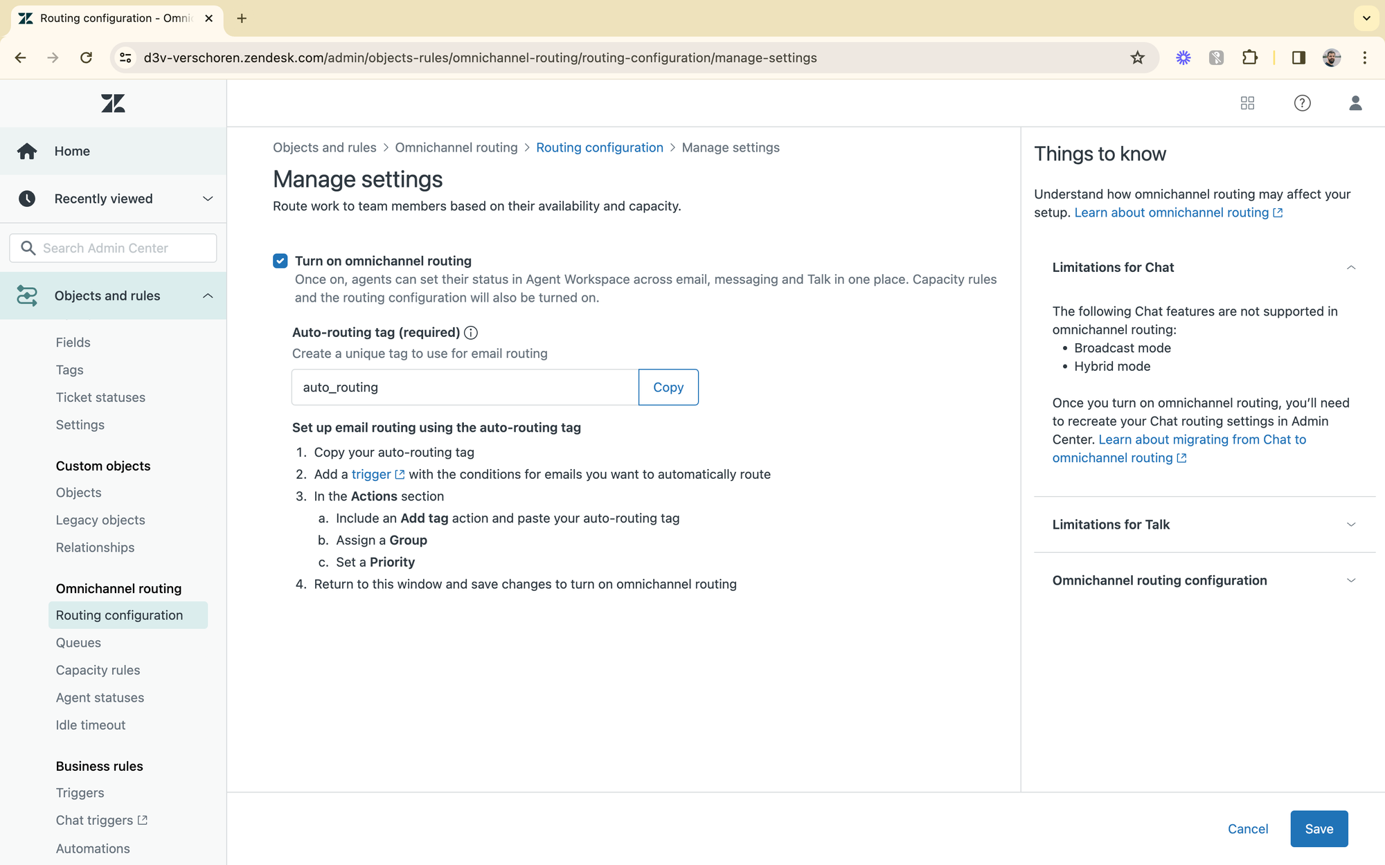To start, you can decide which tag you'll use to identify which tickets should be automatically routed to agents. For my setup I picked auto_routing as a tag.