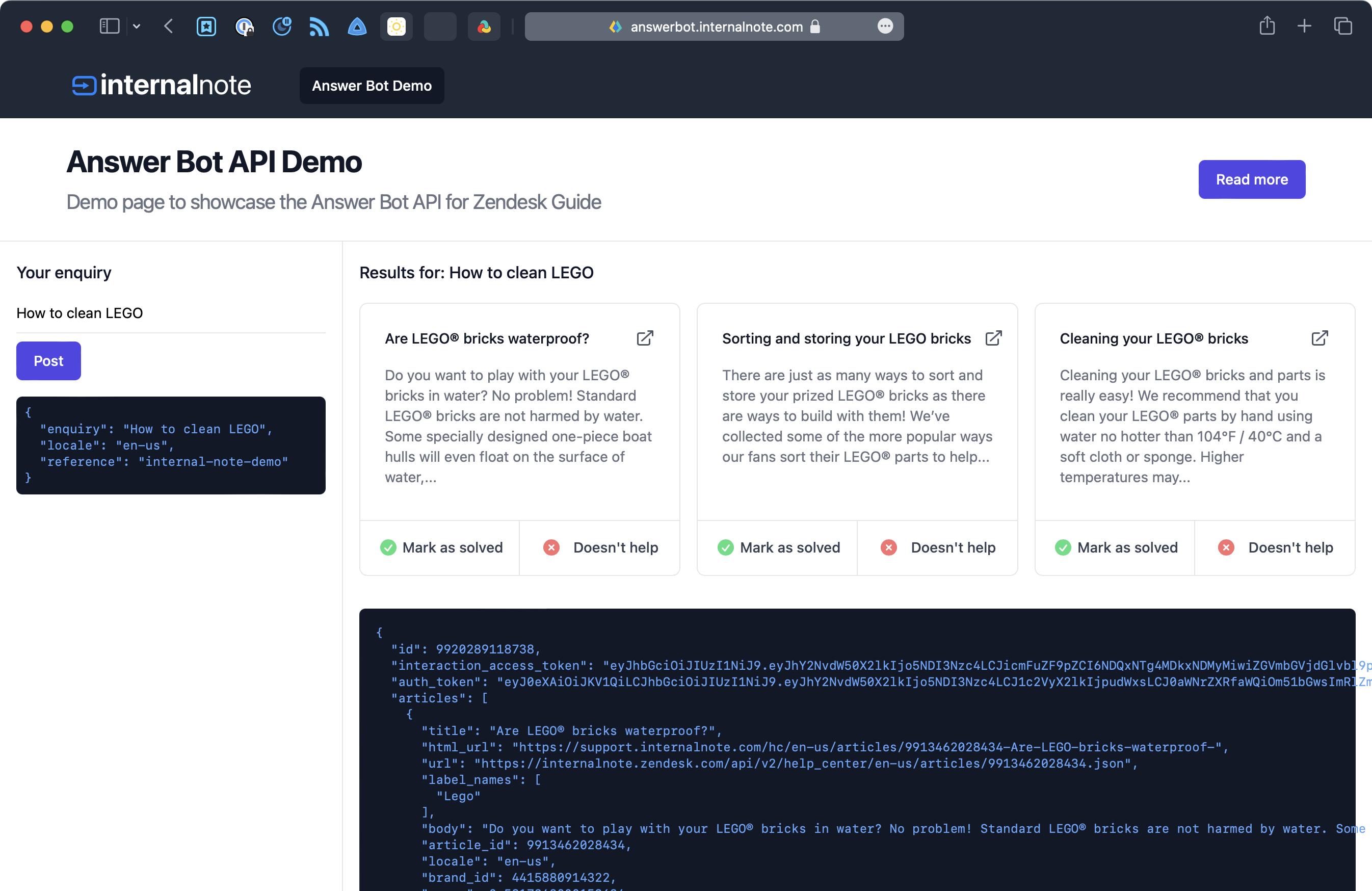 But first, the demo. This small website allows you to enter a search query. It then pulls in data from our Demo Help Center and returns the three recommended articles.