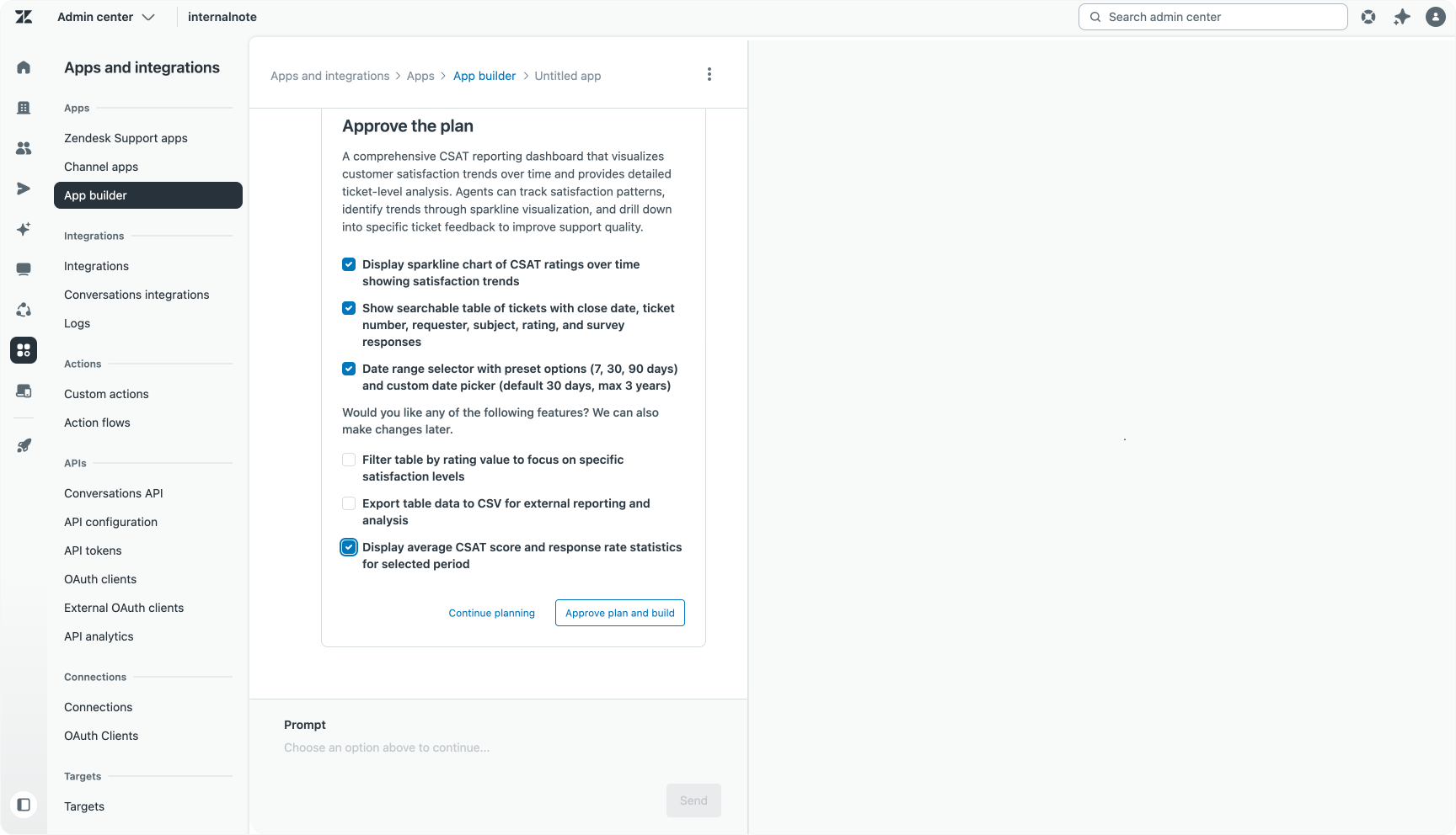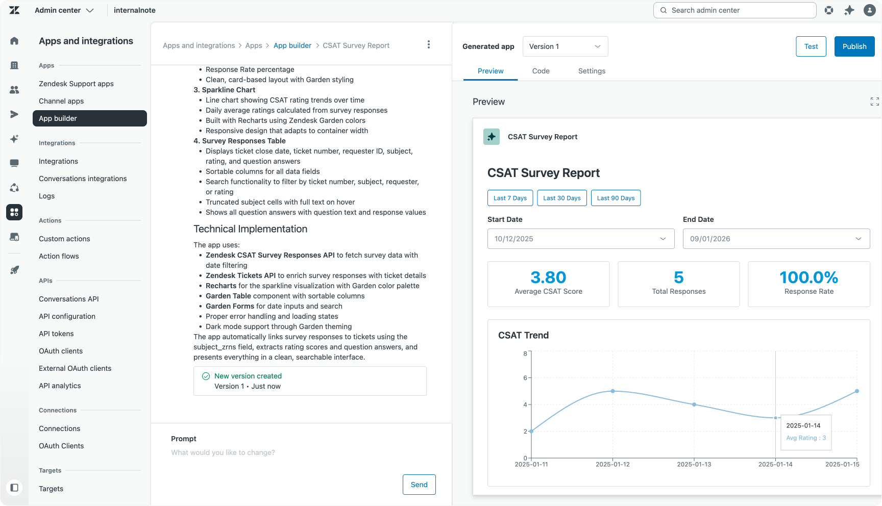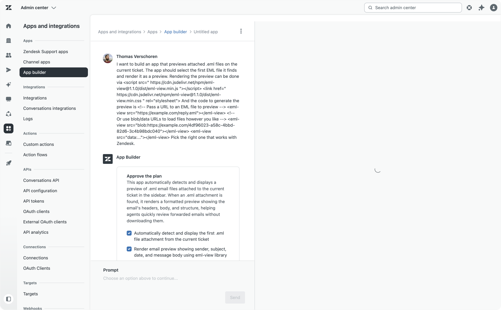 By combining deep platform knowledge, specific coding instructions, and adherence to Zendesk standards into its prompts, App Builder gives users a significant head start compared to generic AI coding tools. This means you can focus on your app’s core functionality without explaining how Zendesk apps work.