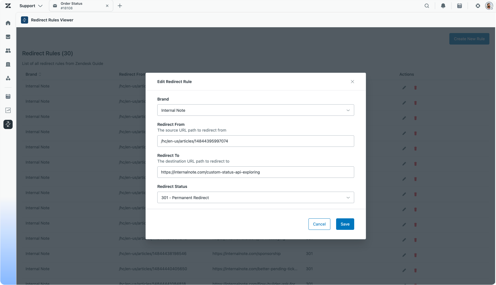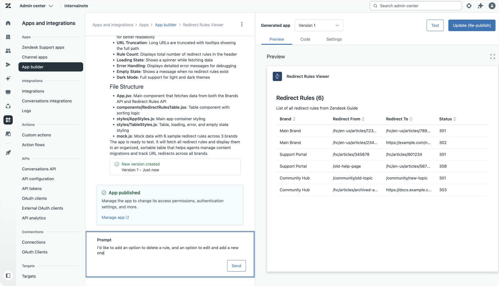I want an app that lists all the redirect rules from GET /api/v2/guide/redirect_rules Should be a table that shows the brand, redirect_from, redirect_to and redirect_statusThe generated app was nearly perfect on the first try. Further refinement was added with a second prompt to enable editing, deleting, and adding redirect rules, turning the raw API into a fully functional management app:
