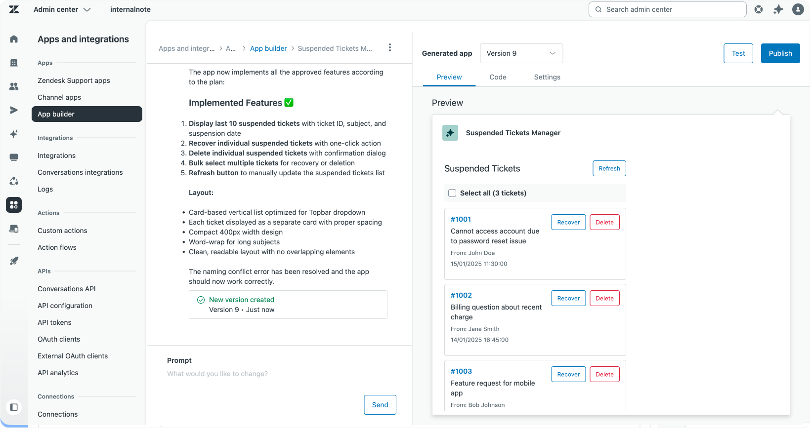 Every app you create with App Builder is stored within a catalog inside Zendesk’s Admin Center. At any point, you can test your current version against real tickets in preview mode. While the App Builder’s built-in preview offers a solid development view, actual ticket testing often reveals bugs or usability improvements that aren’t obvious otherwise.