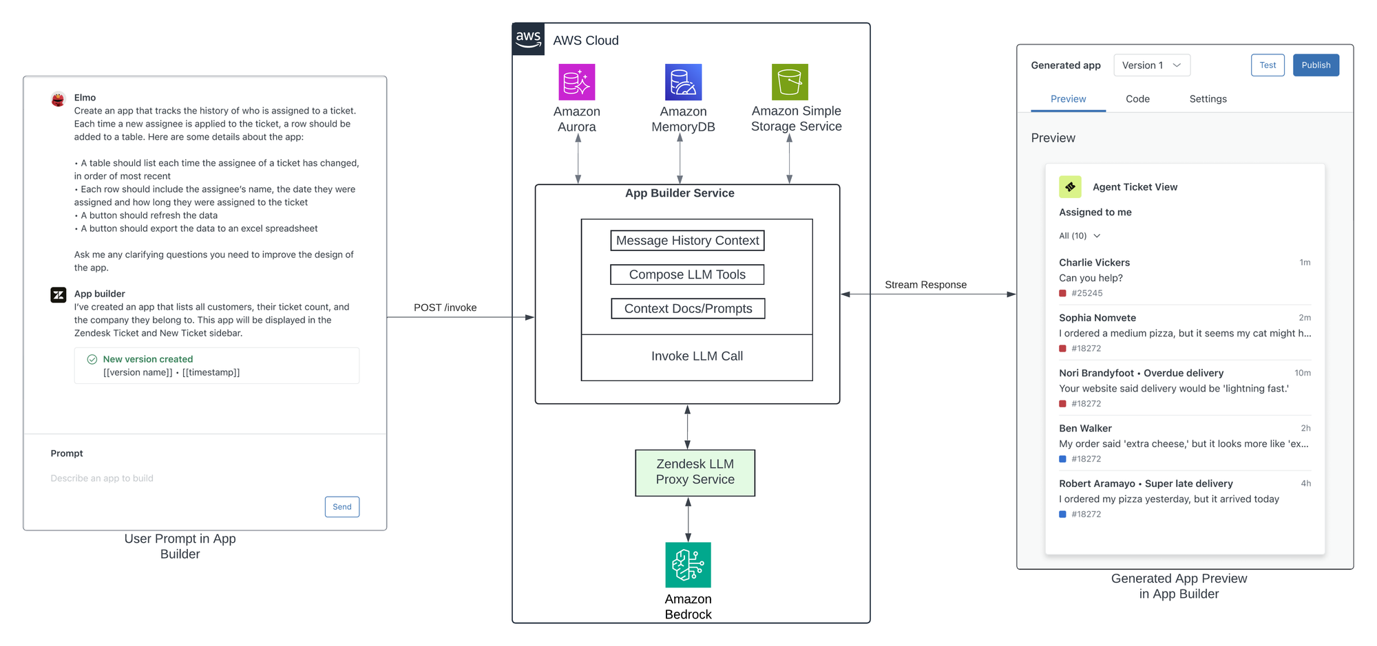 For those interested in the mechanics behind Zendesk’s App Builder, the development team has published an insightful technical deep dive on the Amazon AWS blog. The article explores how App Builder leverages Amazon Bedrock’s foundation models and integrates them with Zendesk’s APIs to enable rapid app generation from natural language prompts.