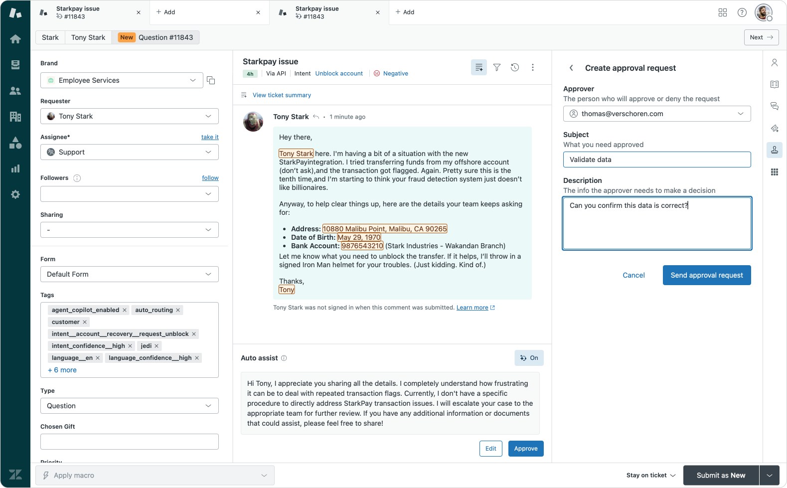 The agent fires off an approval request to get the request approved, making use of Zendesk's now Approval feature, or Sweethawk's Approve app.