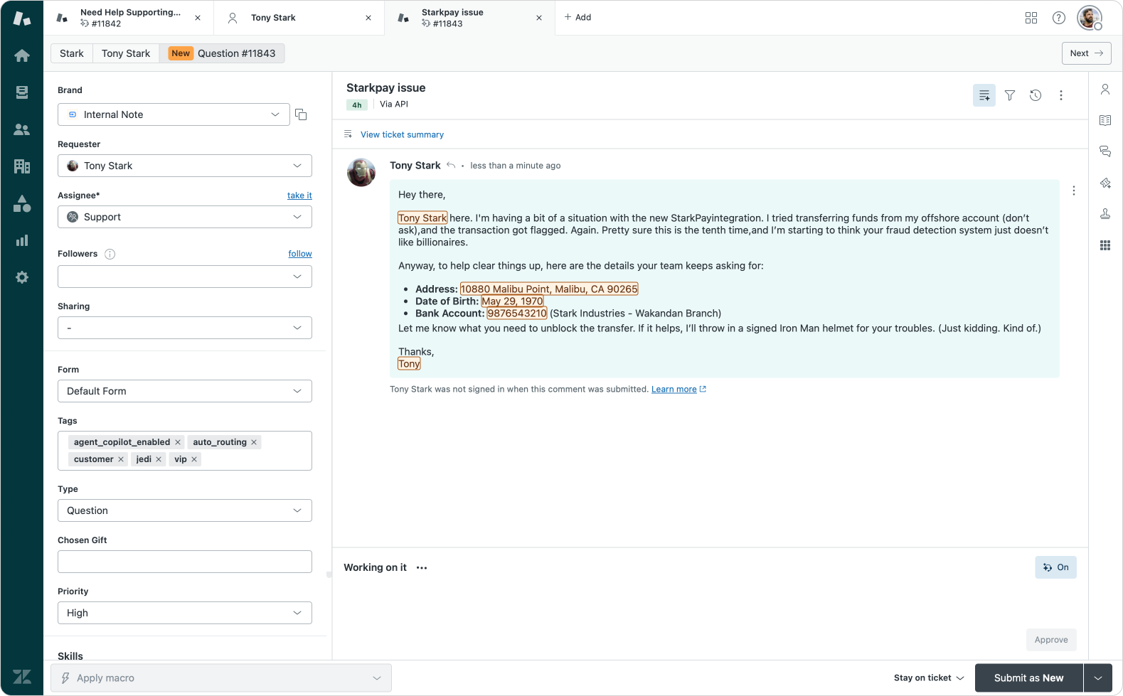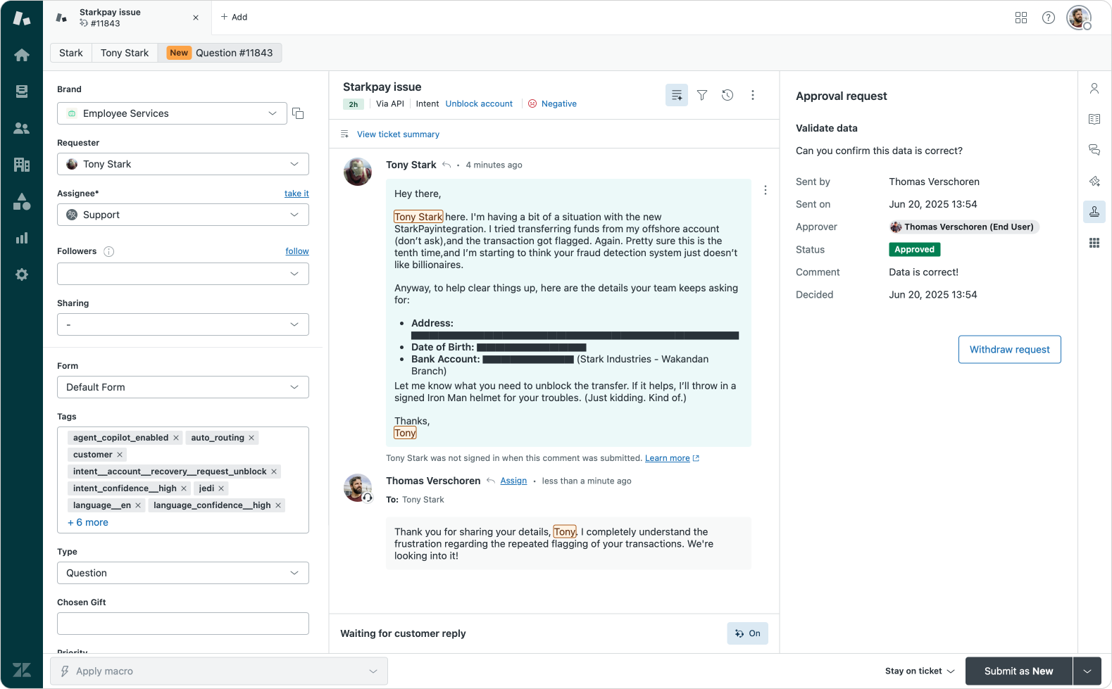 A customer contacts a bank and provides a lot of information to get the request approved. Redaction suggestions already finds and highlights all the information within the ticket.