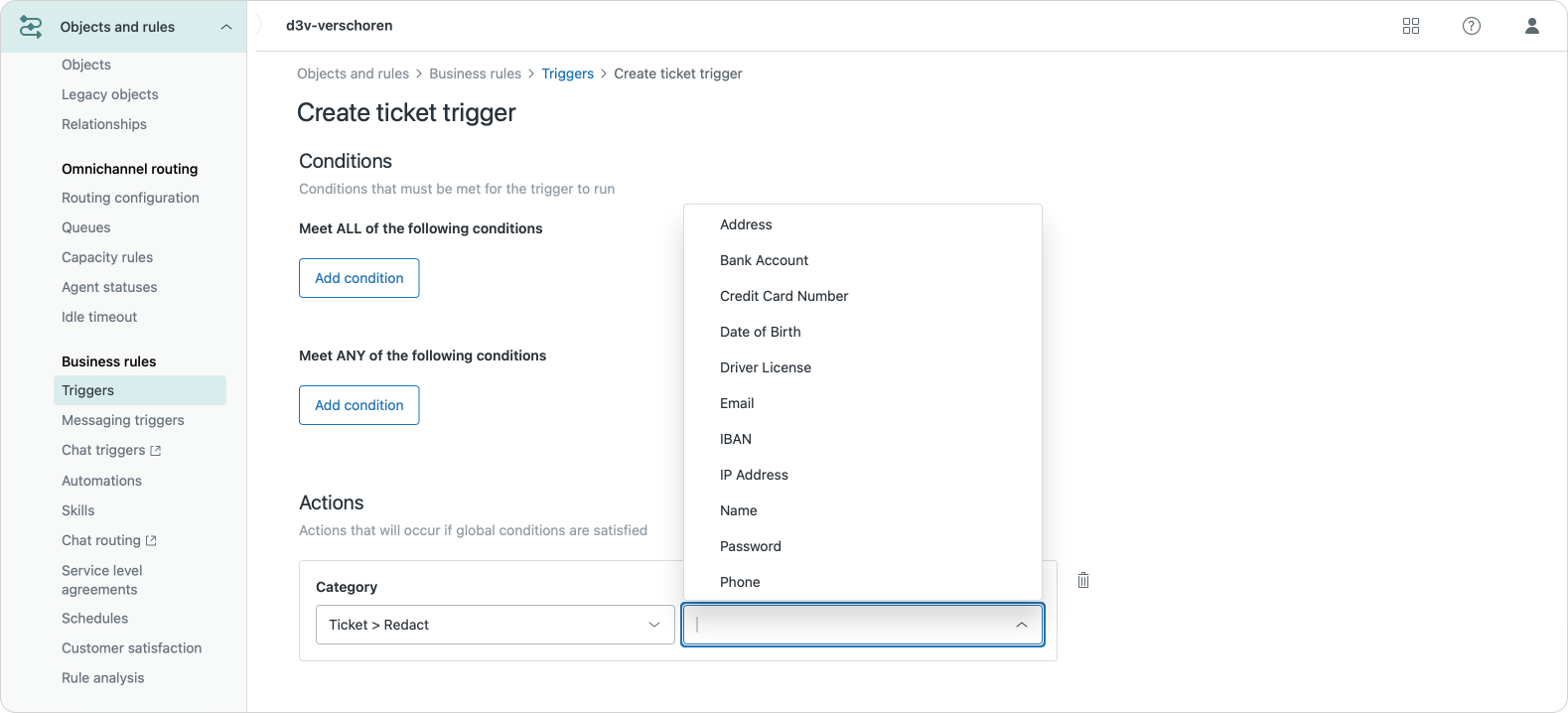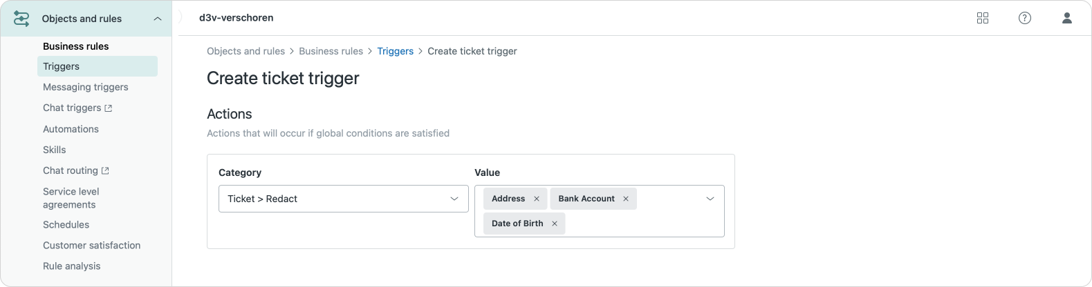 Within triggers you'll now find a new Action to redact information in a ticket. It uses the same PII types as the suggestion redaction feature detects. After you add a few of these data types to your trigger, the system will automatically redact any matching information in your ticket each time the trigger runs.