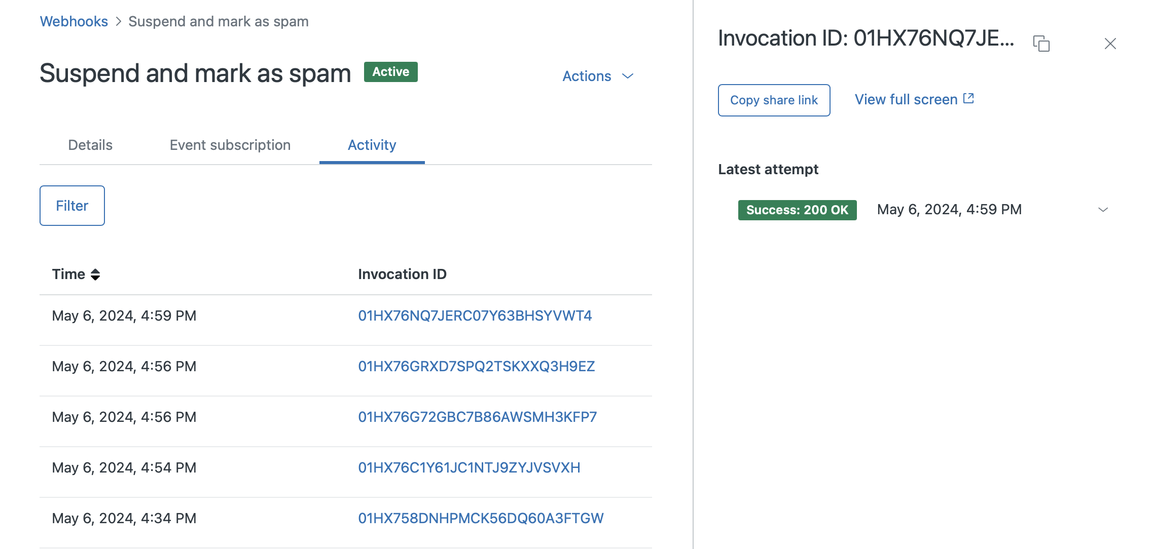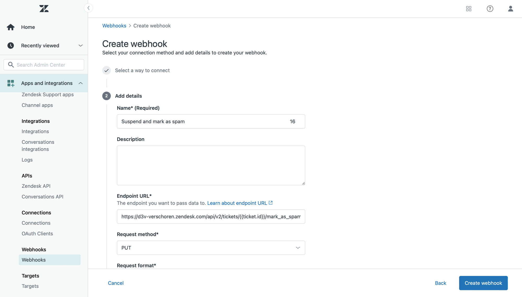 In order to automatically call this endpoint and mark tickets as spam, we'll need to create a webhook.