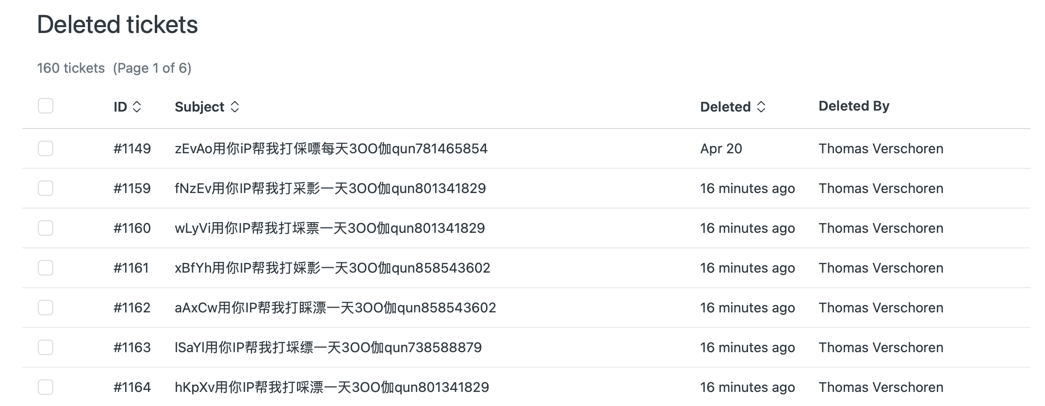 Secondly I noticed that all these tickets have a similar structure in their subject oZxQh用你IP帮我打婇嘌每天3OO伽qun858543602 so I can also use this to identify them.