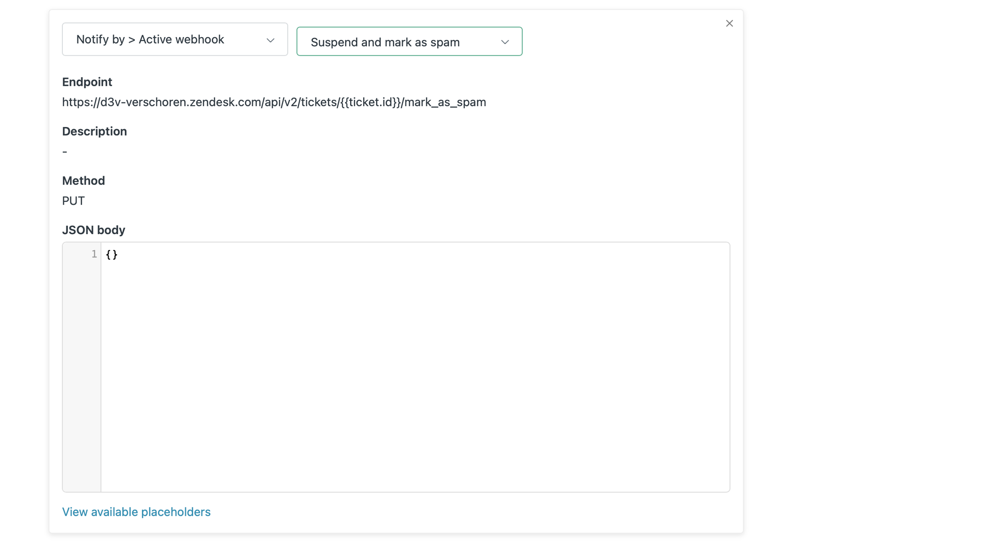https://subdomain.zendesk.com/api/v2/tickets/{{ticket.id}}/mark_as_spamas the Endpoint URL and set the Request Method toPUT. - Authenticate with Basic Authentication with