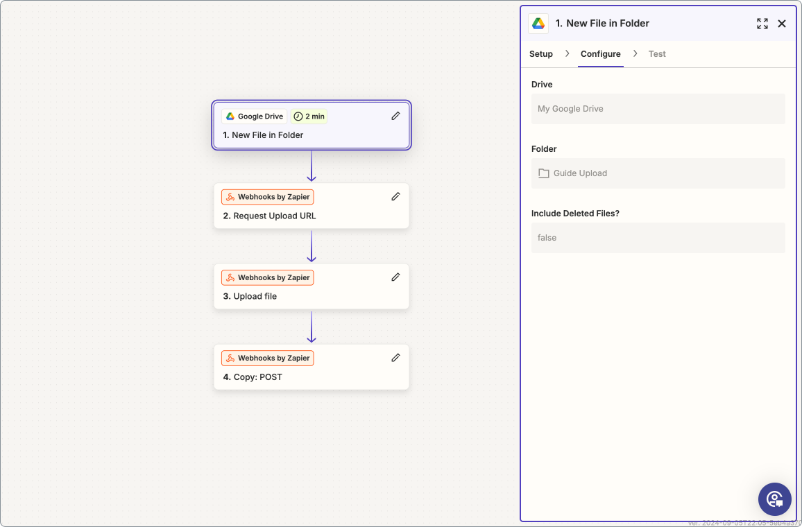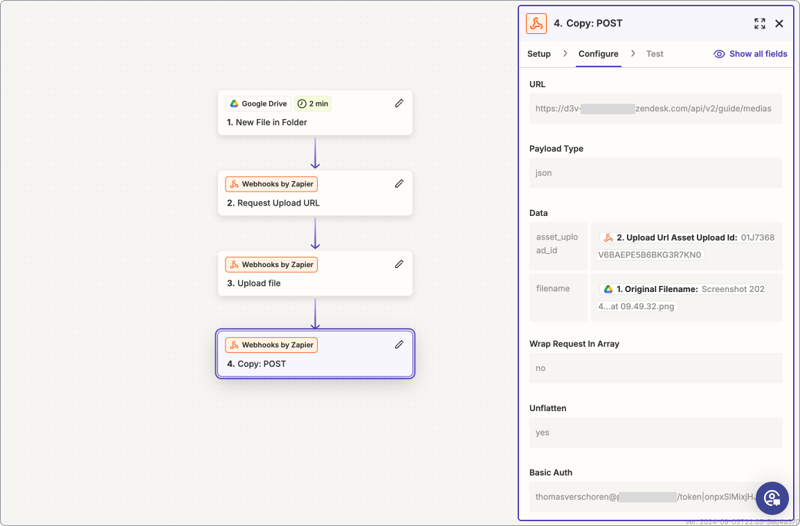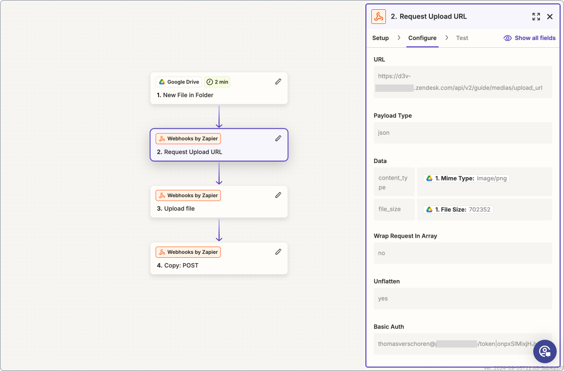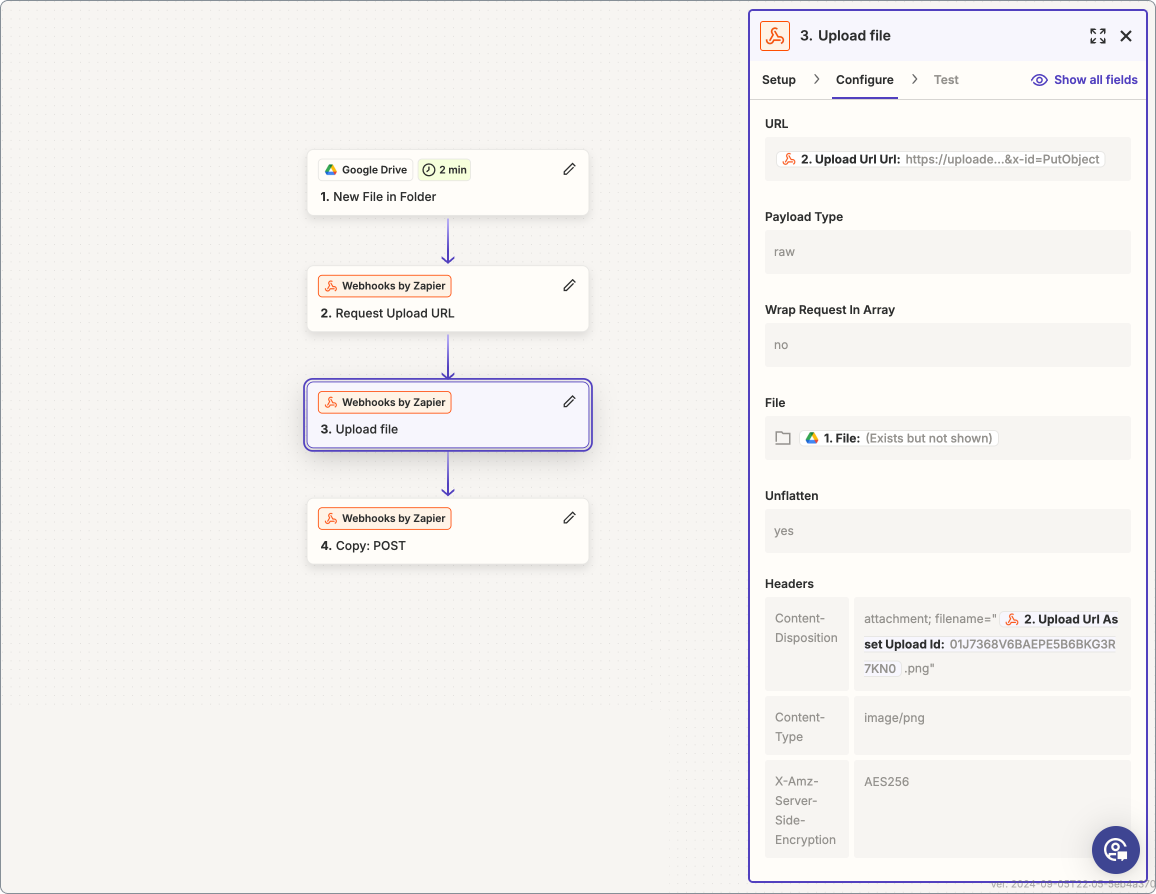 In the second step we use a Webhooks by Zapier step as a POST type to get an Upload URL.