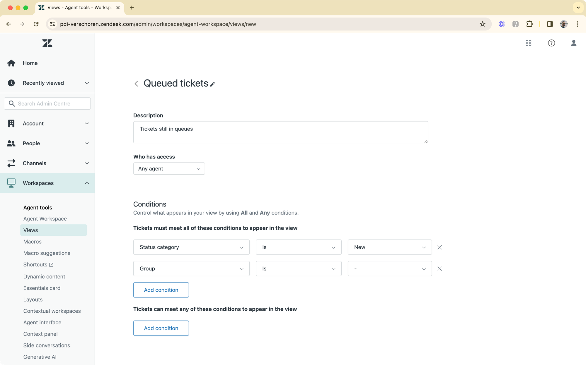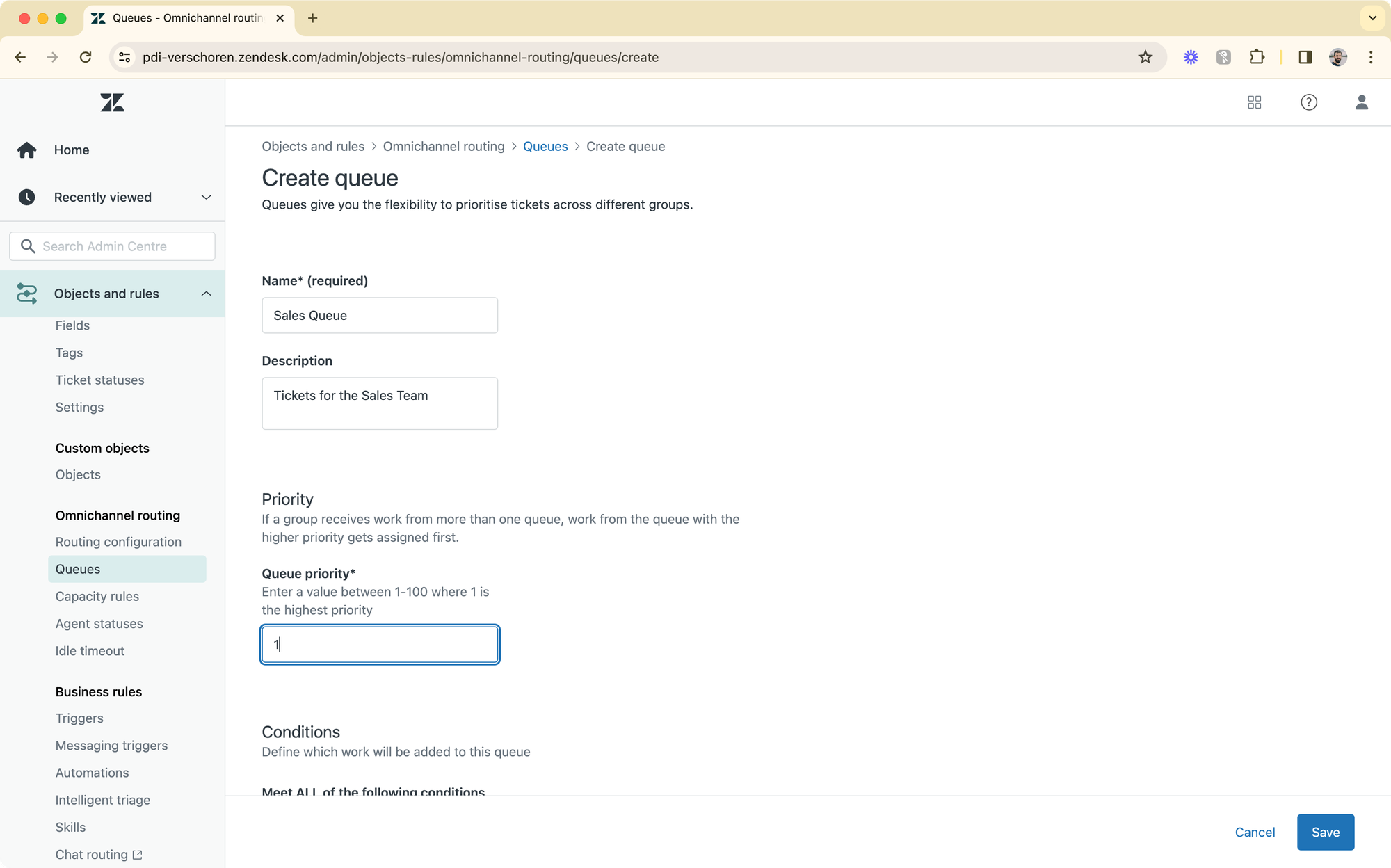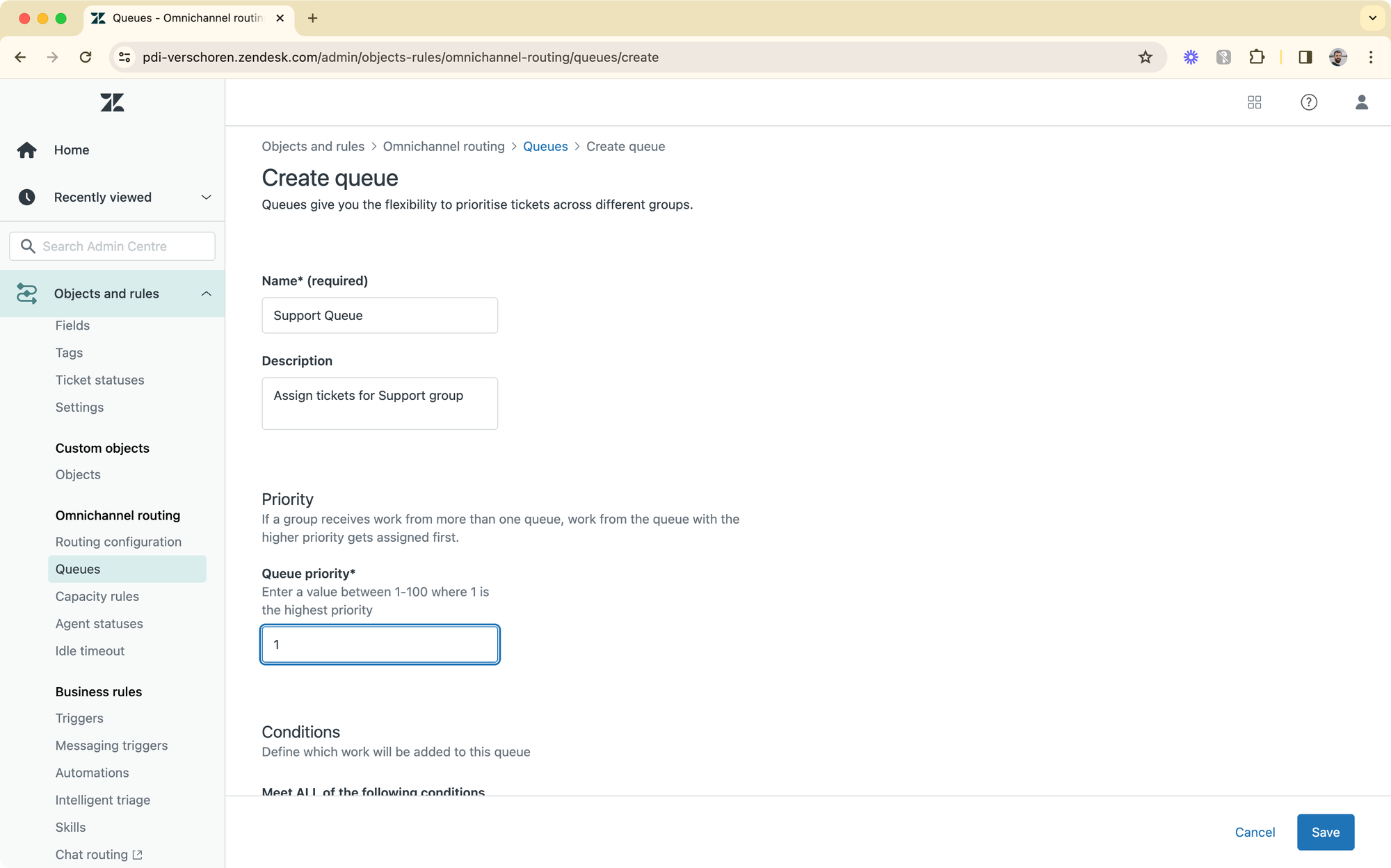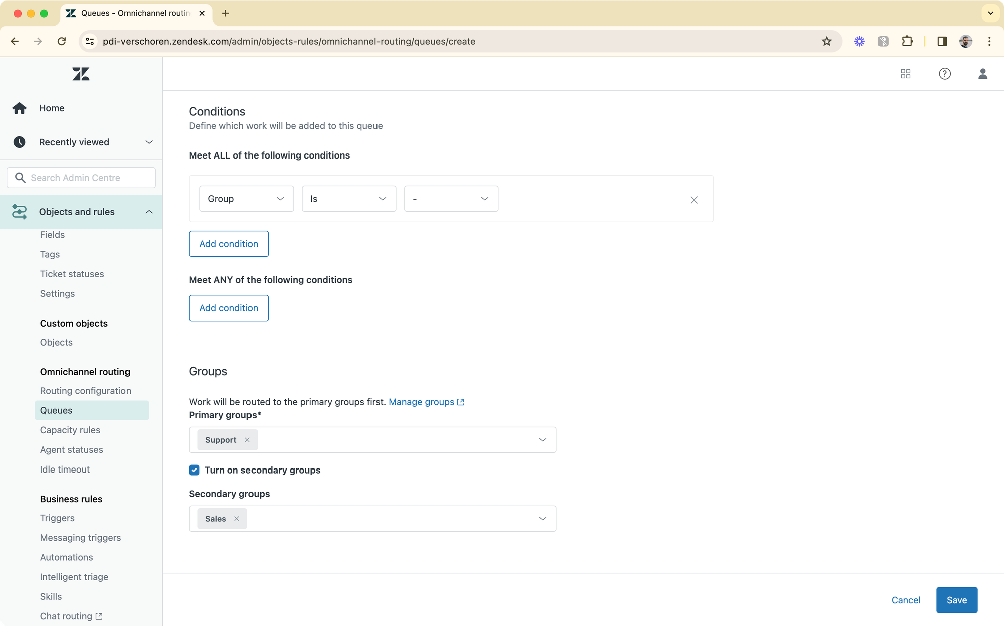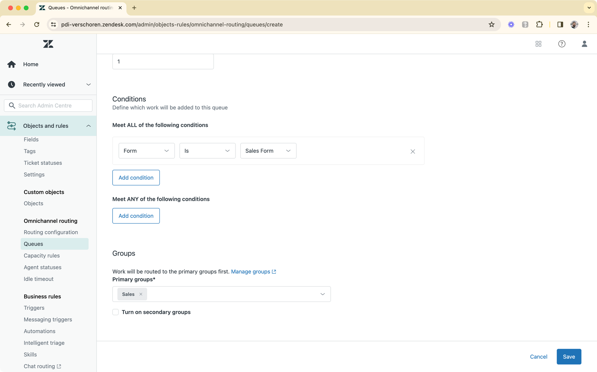 First off, let's create a queue for ticket submitted through the support form. Similar to triggers, we set the conditions (e.g. form = support form) and then we select a primary group to handle these tickets. In our case, this would be the support group.