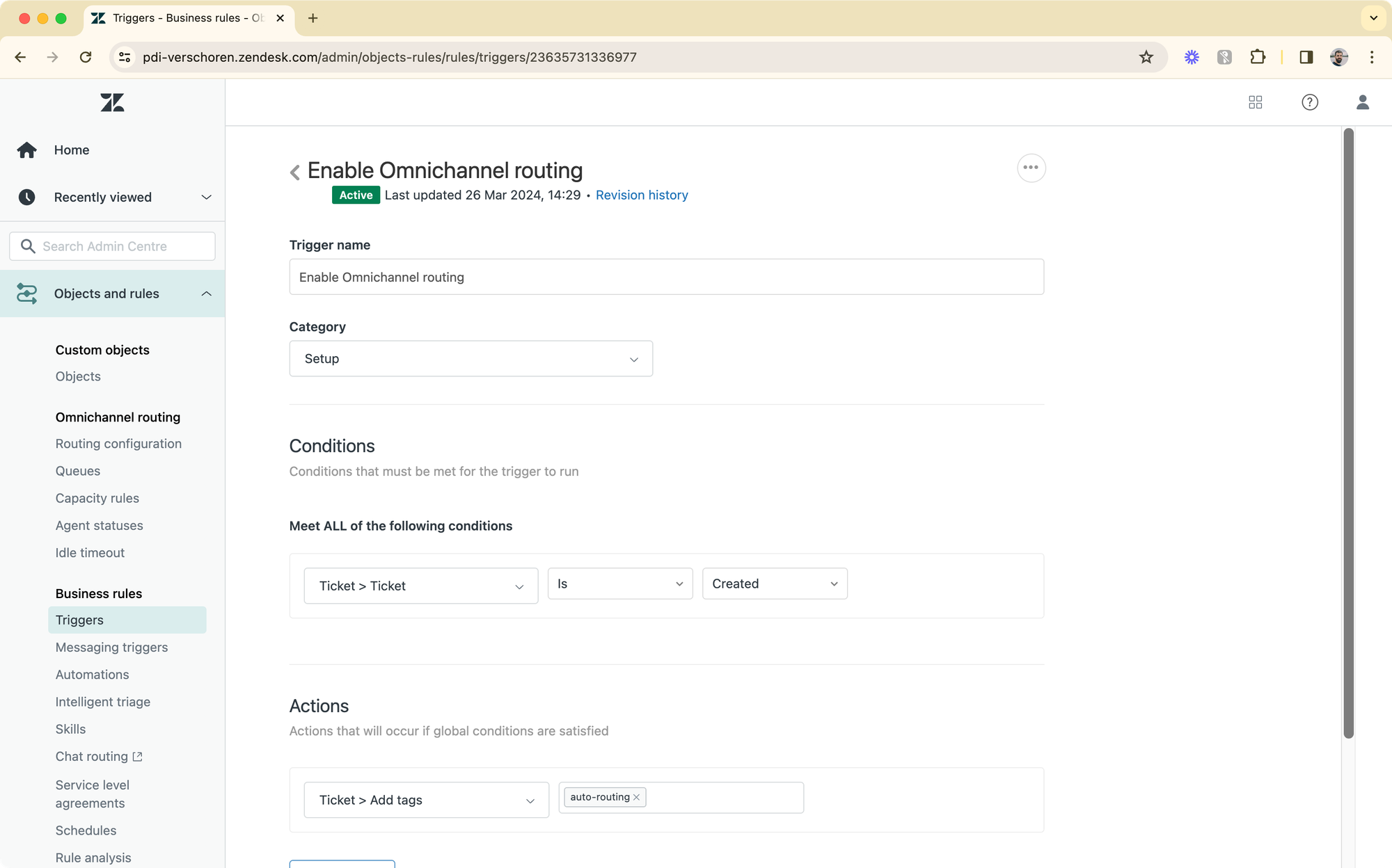 This first trigger adds my Omnichannel Routing tag auto-routing to all created tickets. This enables the tickets to be routed.