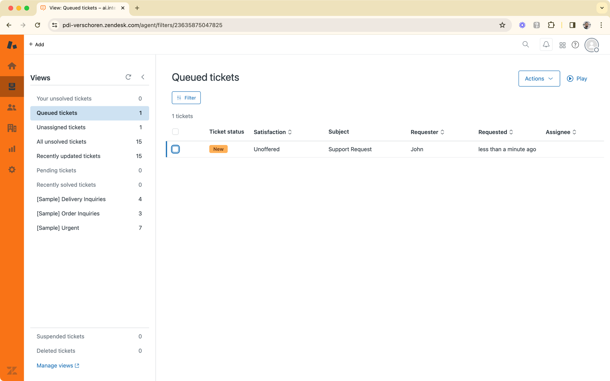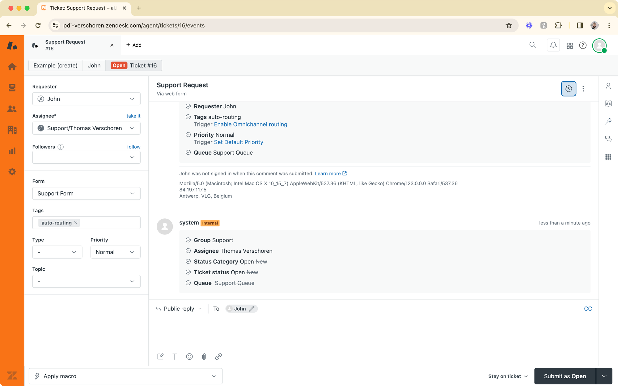 - The ticket is assigned to the Support queue. You can verify this via the ticket events view.