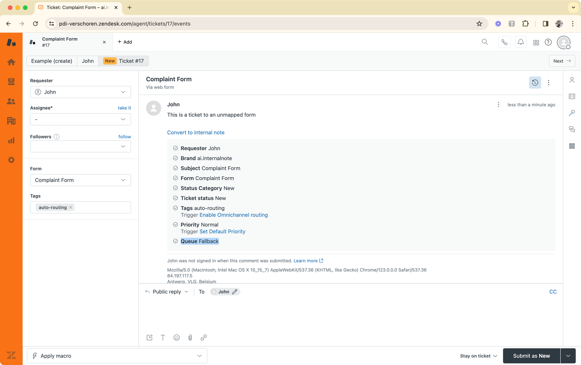 In the example below a ticket was created in the Complaint Form. Since this is not an existing condition in any of my queues, it's assigned to the fallback queue.
