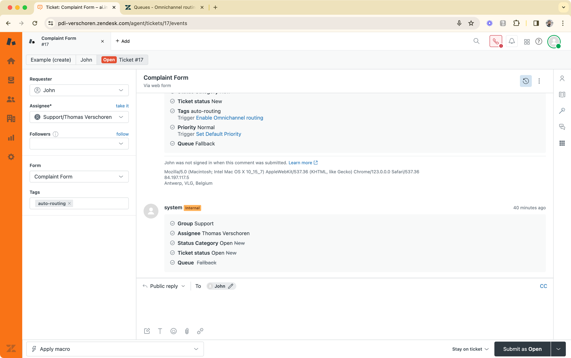 When a customer creates a ticket, this ticket will be tagged and enable Omnichannel Routing to start doing its thing.