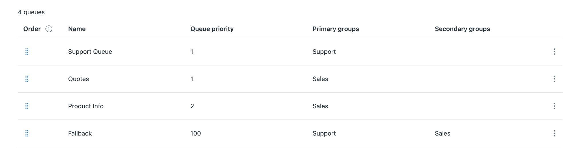 Imagine we have two types of tickets for Sales: Product Info, and Quotes. We can create two queues for sales. A Quotes queue with a priority 1, and a Product Info queue with priority 2.