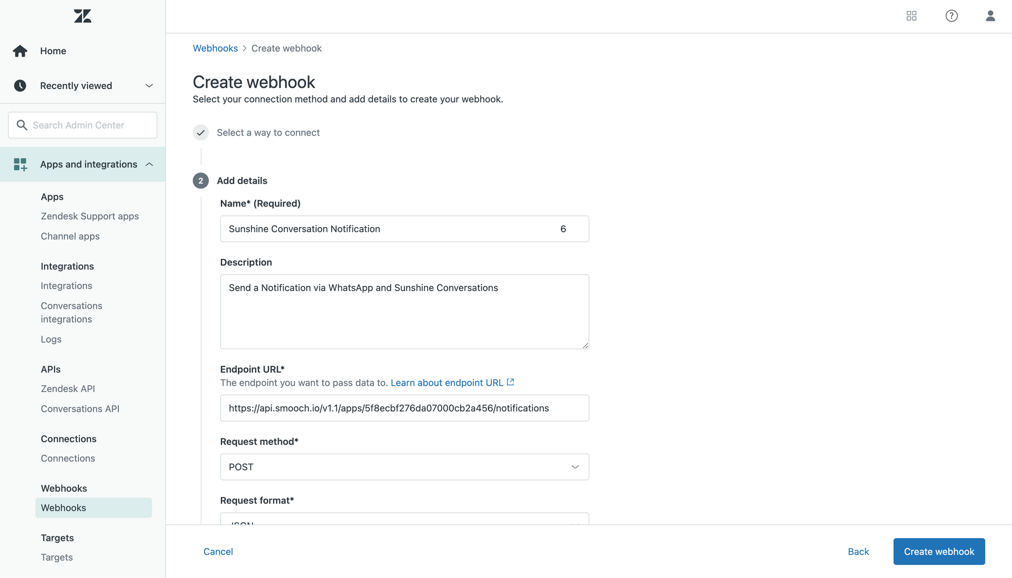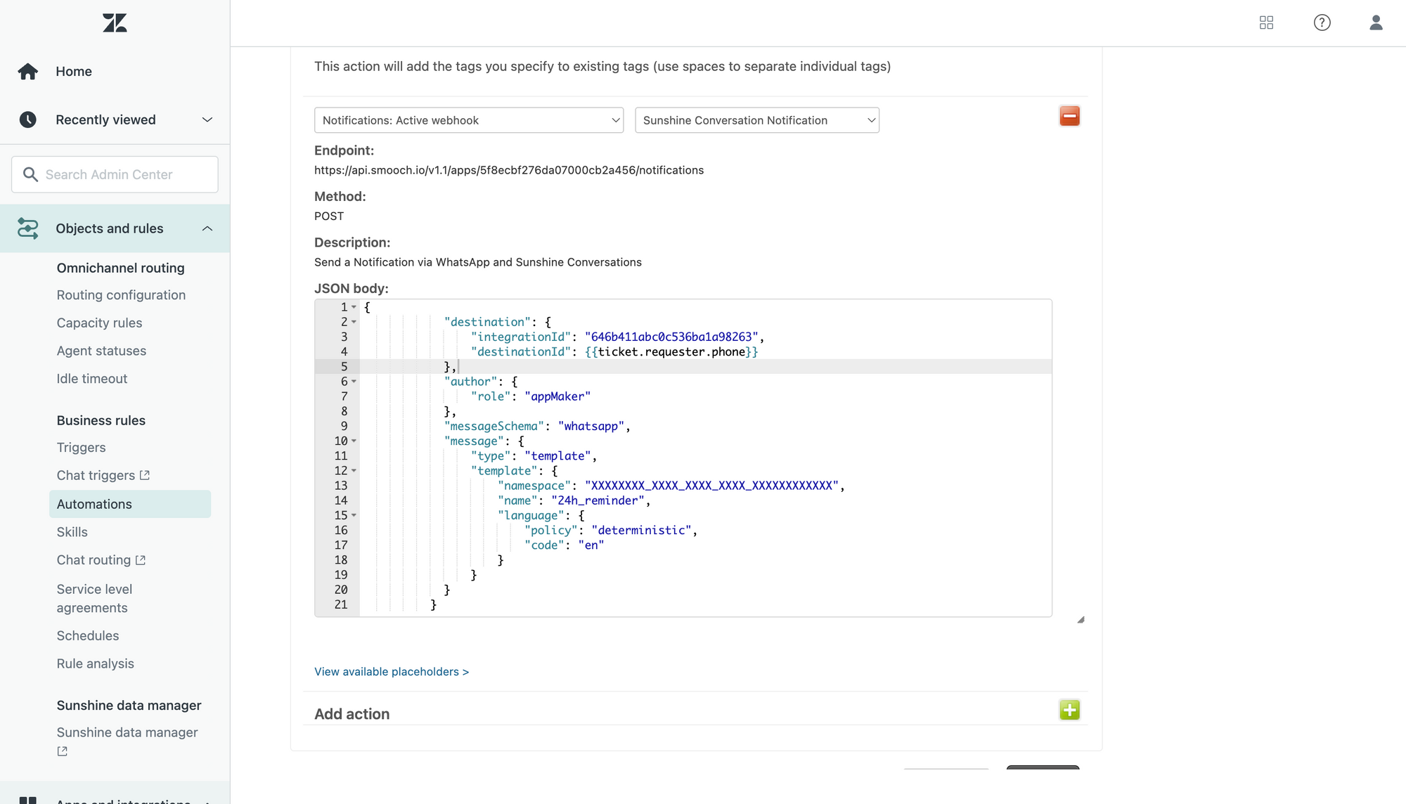 Now choose Notifications - Webhook: Sunshine Conversations Notifications as the action, and add the following in the JSON body field. Make sure to replace the [integration_id] with yours.