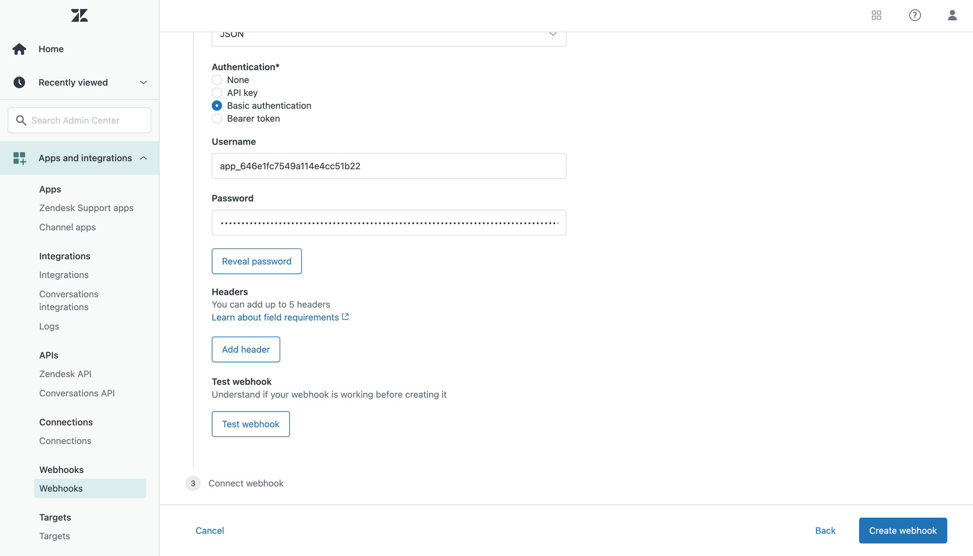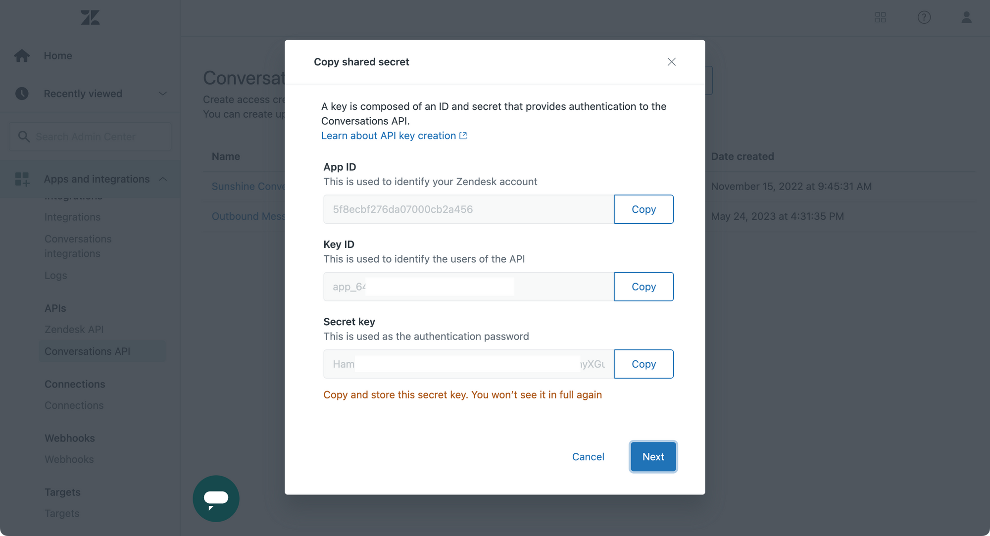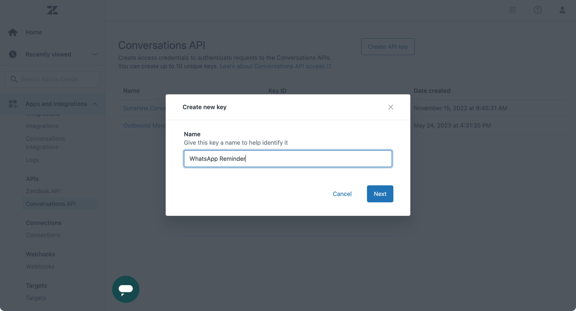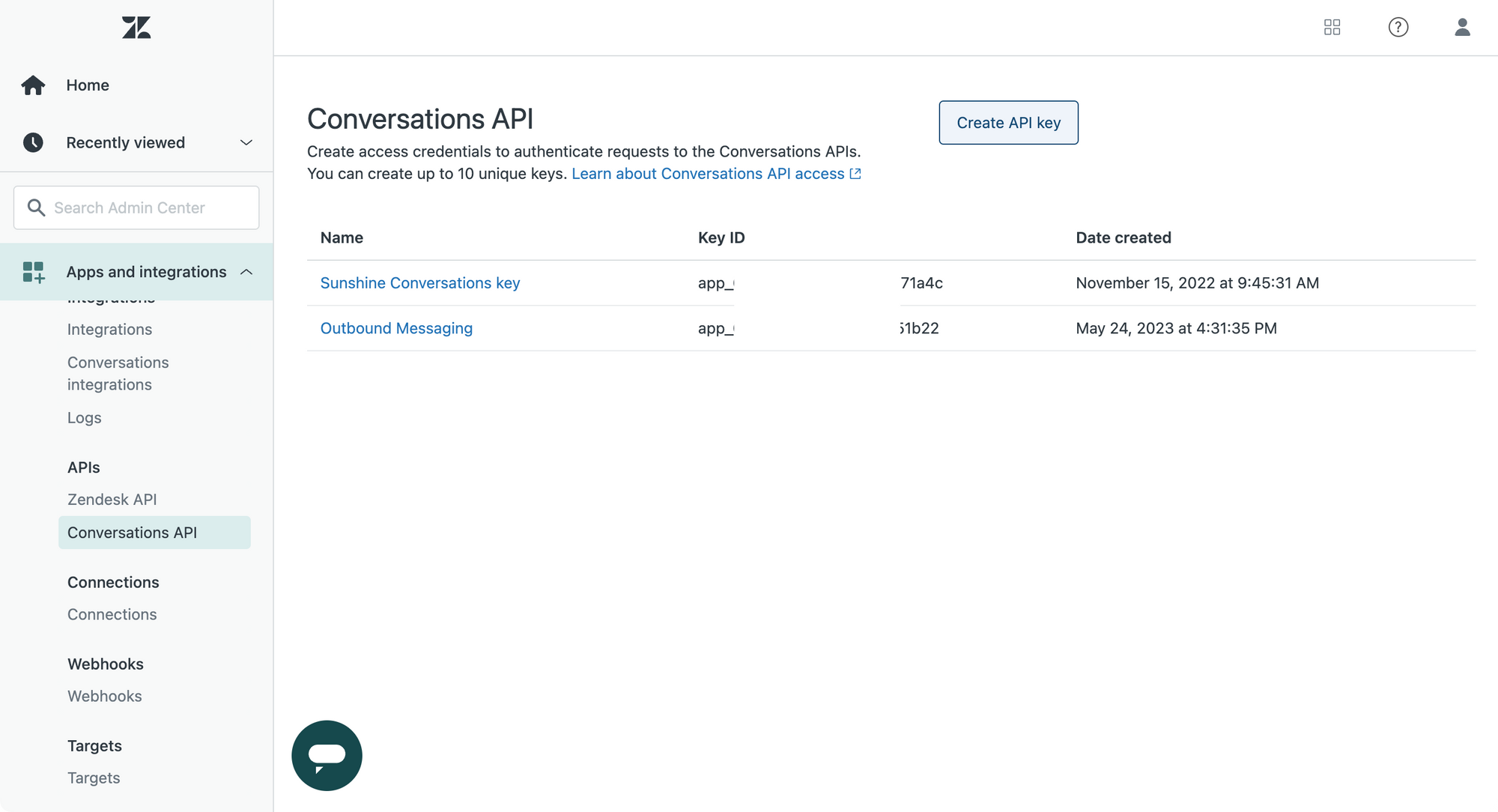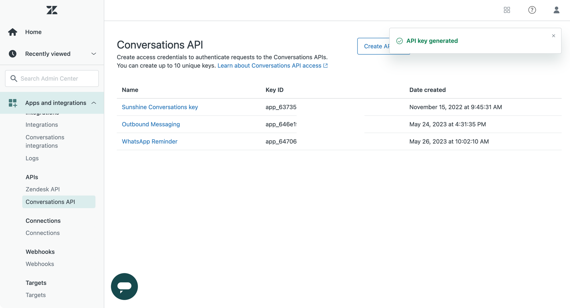 Go to the Admin Center > Apps and Integrations > APIs > Conversations API and click Create API Key. Give it a name and copy the 3 values Zendesk shows somewhere safe. You'll need this App ID, Key ID and Secret Key in the next steps.