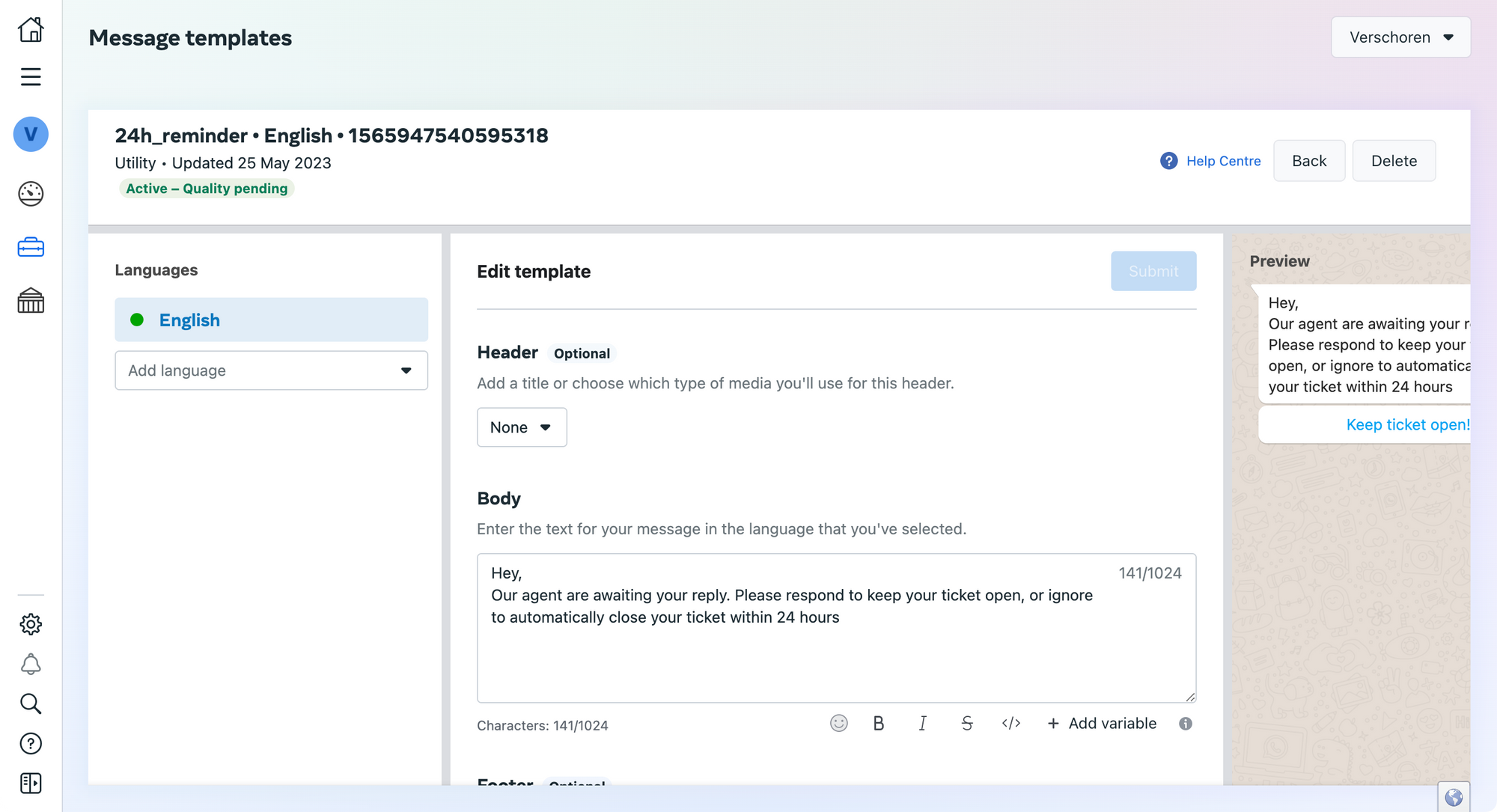 WhatsApp for example has a 24-hour rule which prevents business integrations from replying to customers that haven't interacted with your business for over 24 hours. Example: If a customer sends a ticket at 10AM, you need to make sure your agent replies AND you get a reply from the customer before 10AM the next day. If those 24h pass without a customer reply to your agents' remark, you can't send any reminder or more info to that customer anymore.
