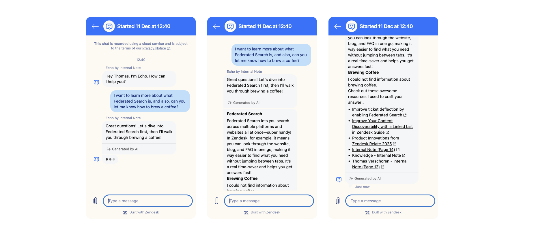 Zendesk addresses this through its knowledge graph: a unified index that brings external sources alongside your Help Center articles. Public websites can be indexed via Federated Search or a dedicated web crawler, making your product pages and documentation available as knowledge sources without any duplication. For internal tools, Knowledge Connectors handle the sync: Confluence is already supported, with SharePoint, Notion, Asana and Google Drive on the roadmap. Once connected, content from these sources appears natively in Agent Workspace and feeds AI Agents just as Help Center articles do, with usage feeding back into your analytics. The key advantage of native connectors over custom-built alternatives is that knowledge gaps and improvement suggestions propagate across all indexed sources, not just your Help Center.
