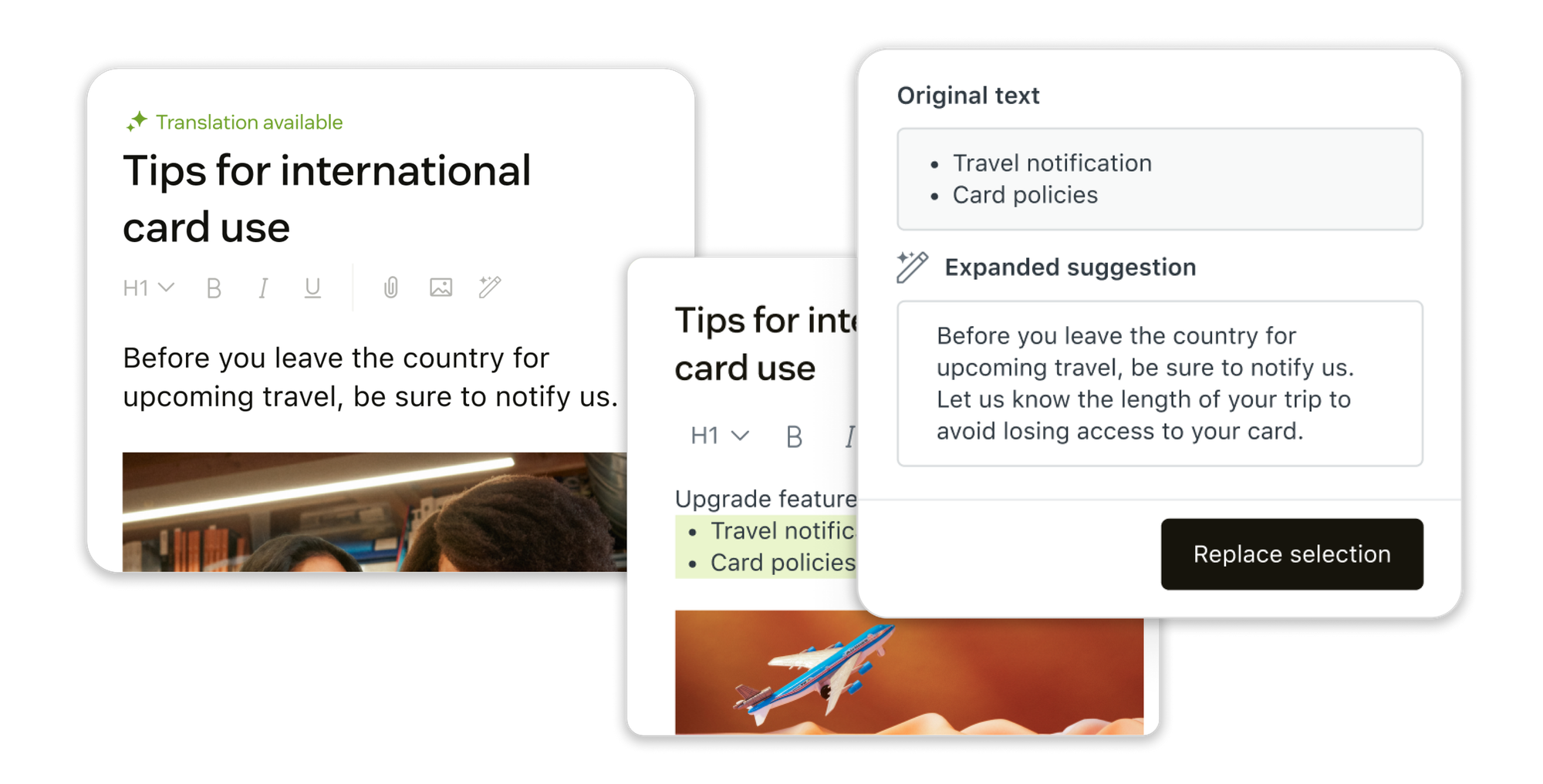 The article editor's AI writing tools make acting on those flags faster. Agents or content owners can expand a rough note into a full article, simplify a dense procedure, or shift the tone to match the right audience, all without starting from scratch. Combined with built-in AI translation, it becomes realistic to keep a multilingual knowledge base current without a dedicated translation team.
