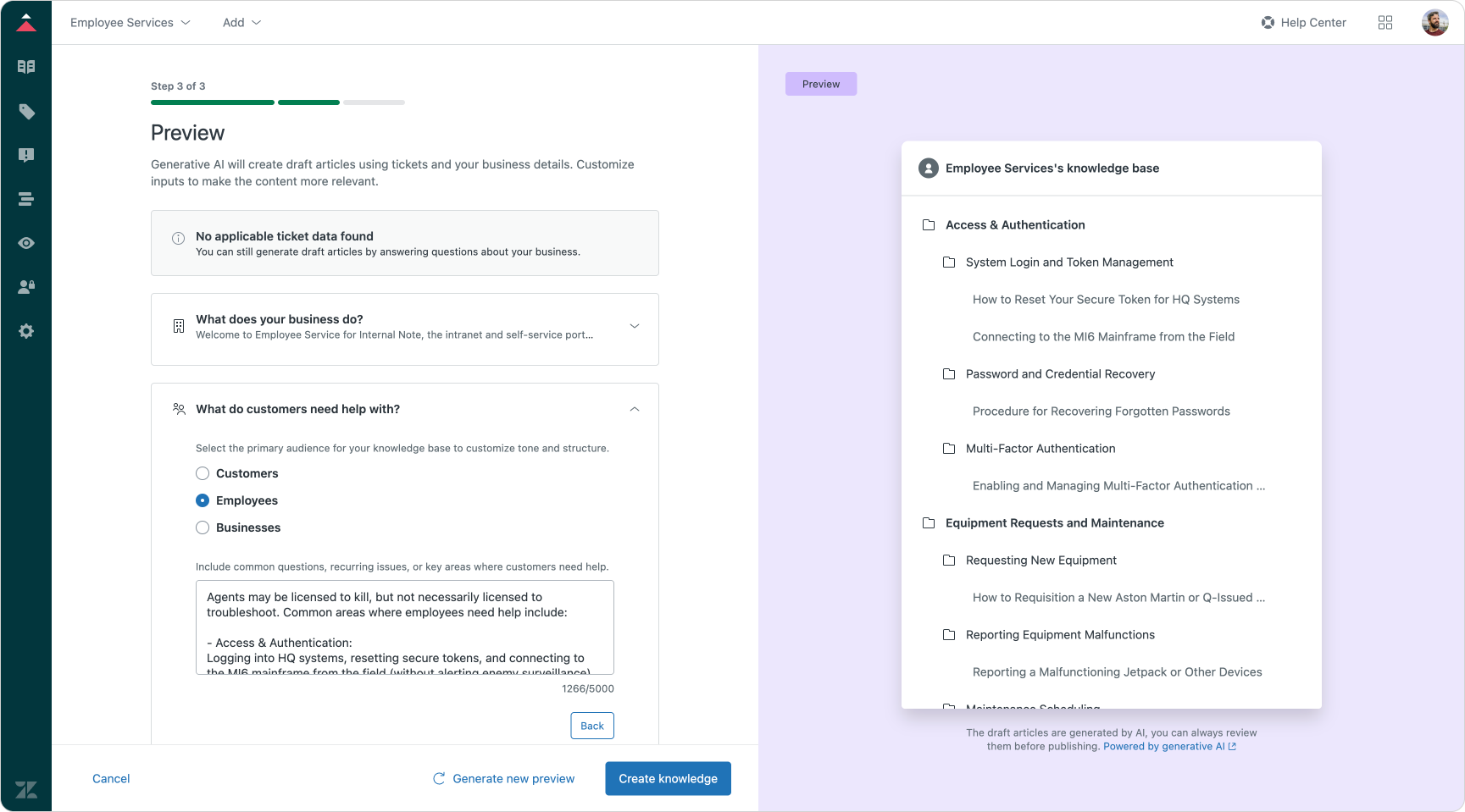 Turn your plan into practice by creating well-structured, standardised articles that directly address user needs. Connect disparate knowledge sources, from internal wikis to external repositories, into a single unified foundation. Tools like Knowledge Builder can help accelerate content creation and make sure your knowledge base is both comprehensive and optimised for AI retrieval.