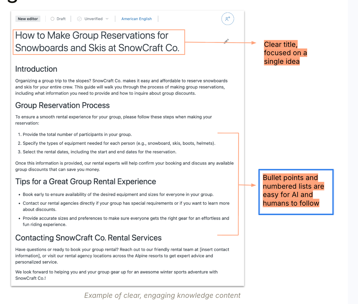 - Structured and searchable. Well-structured knowledge, aligned with customer intents, makes it easier for both AI and humans to find what they need quickly. That means clear and descriptive titles, articles focused on a single idea, and bullet points or numbered steps that are easy to scan.