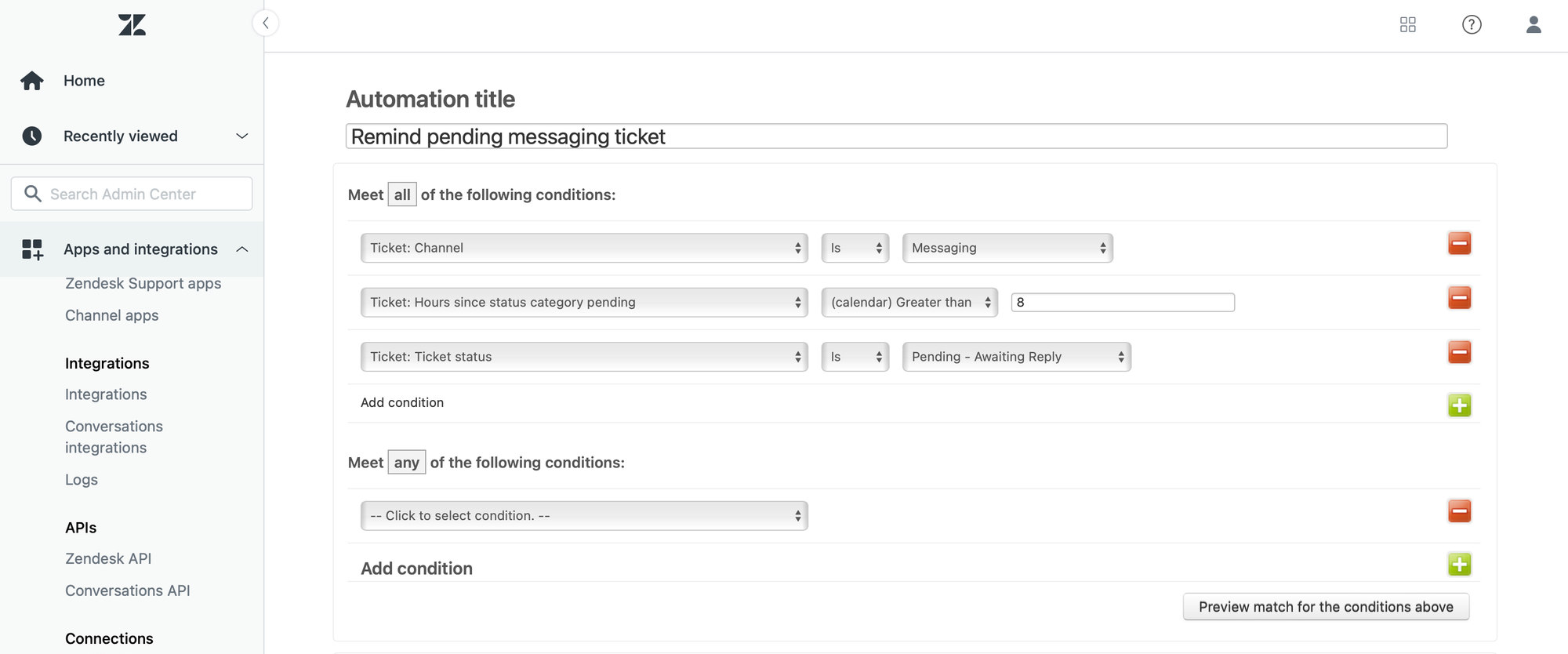 Assuming we want to send out a reminder to our customer after eight hours, we can setup an automation with the following conditions: