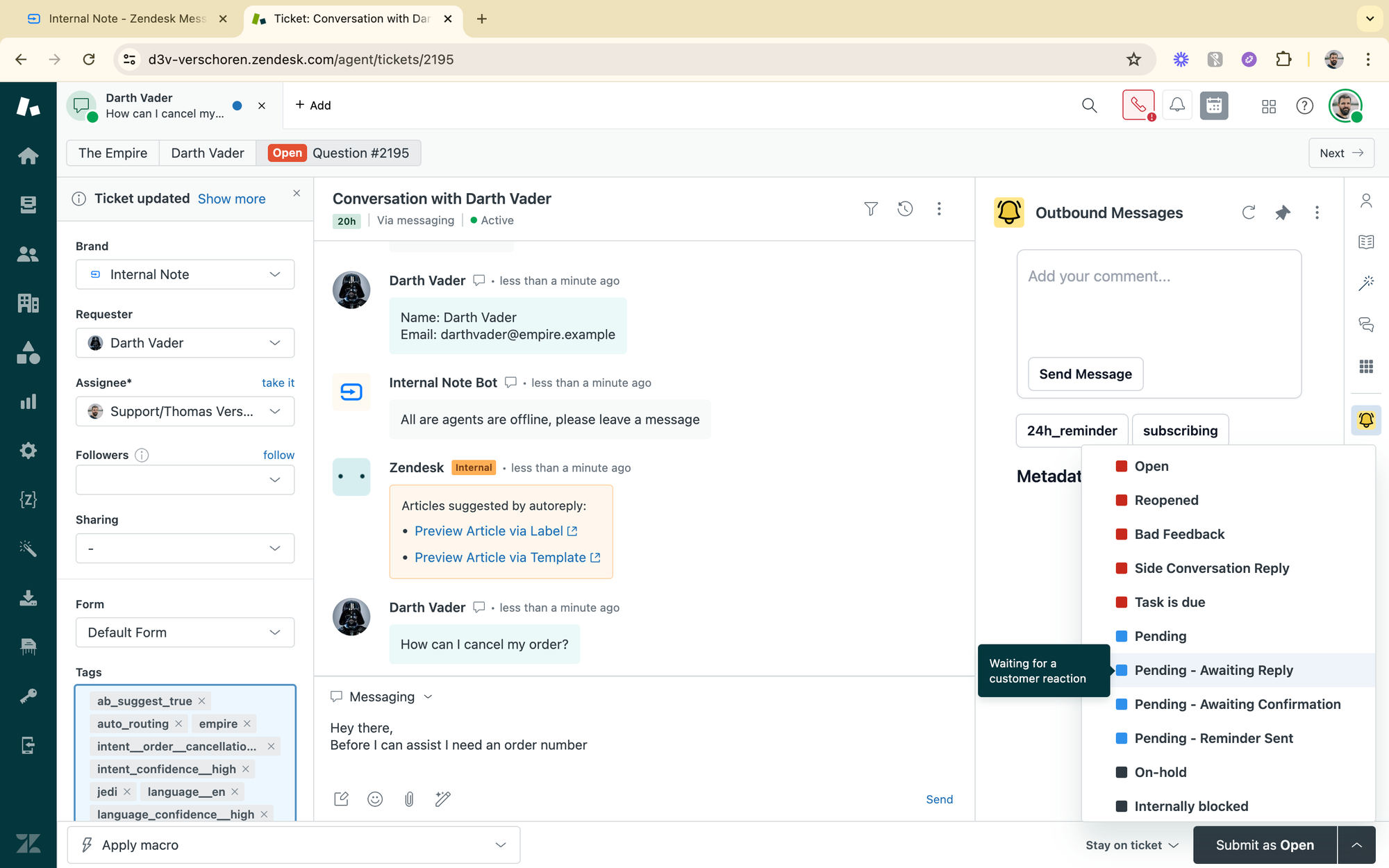 Those reminders make sure your agents get the responses they need, and if no response is given, we can either reopen the ticket so the agent can do one final attempt to reach the customer, or an automation or the agent can manually or silently solve the ticket to remove it from our active tickets altogether.