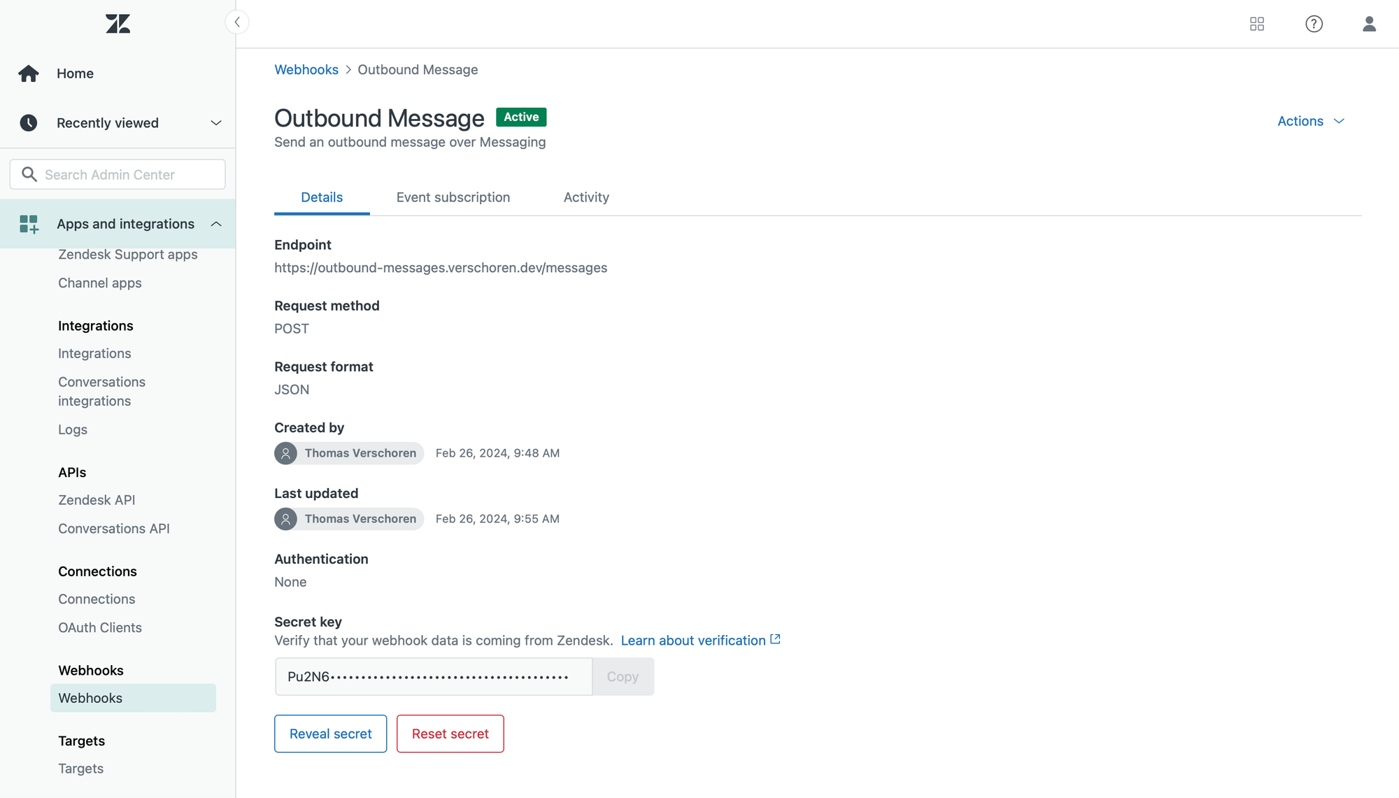 Secondly we need a webhook that calls our worker (or other cloud function). Assuming you deployed the Cloudflare Worker, your webhook will be hosted on https://outbound-messages.yourdomain.workers.dev