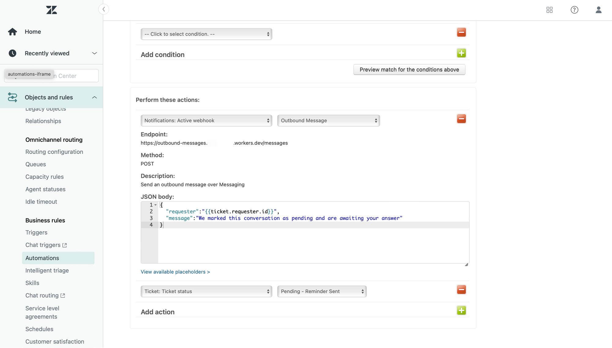 As explained in the original article, the Sunshine Conversations API requires some identifiers that are not natively accessible in Zendesk triggers and automations. We need a conversation id and a user identity . We can derive both from the requester_id of our ticket requester, but even so, we can't connect to the Sunshine Conversations API directly from our triggers.