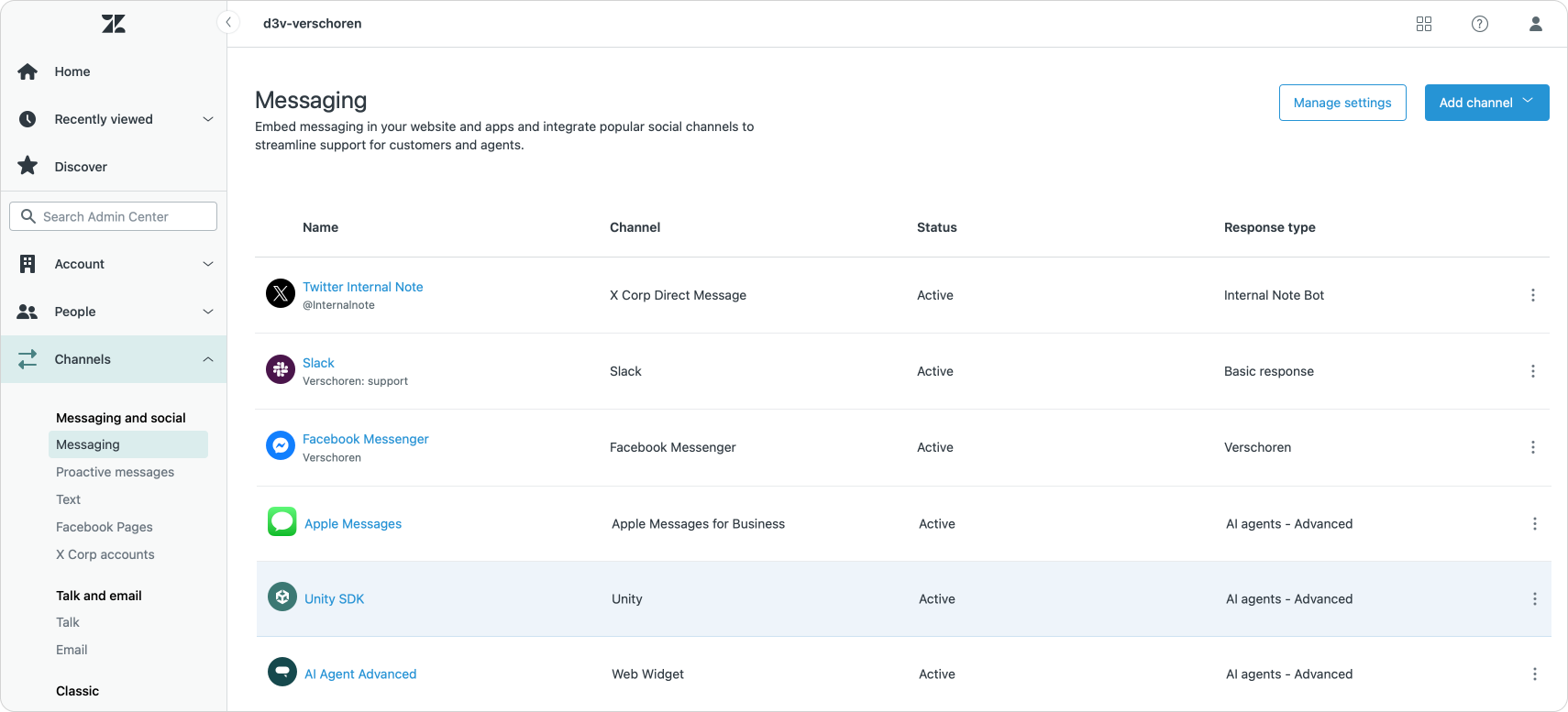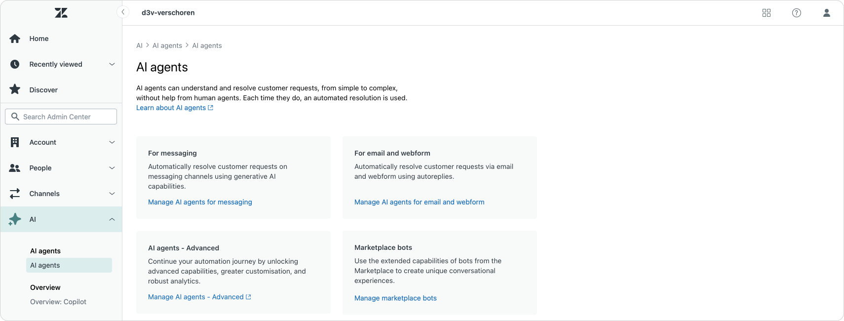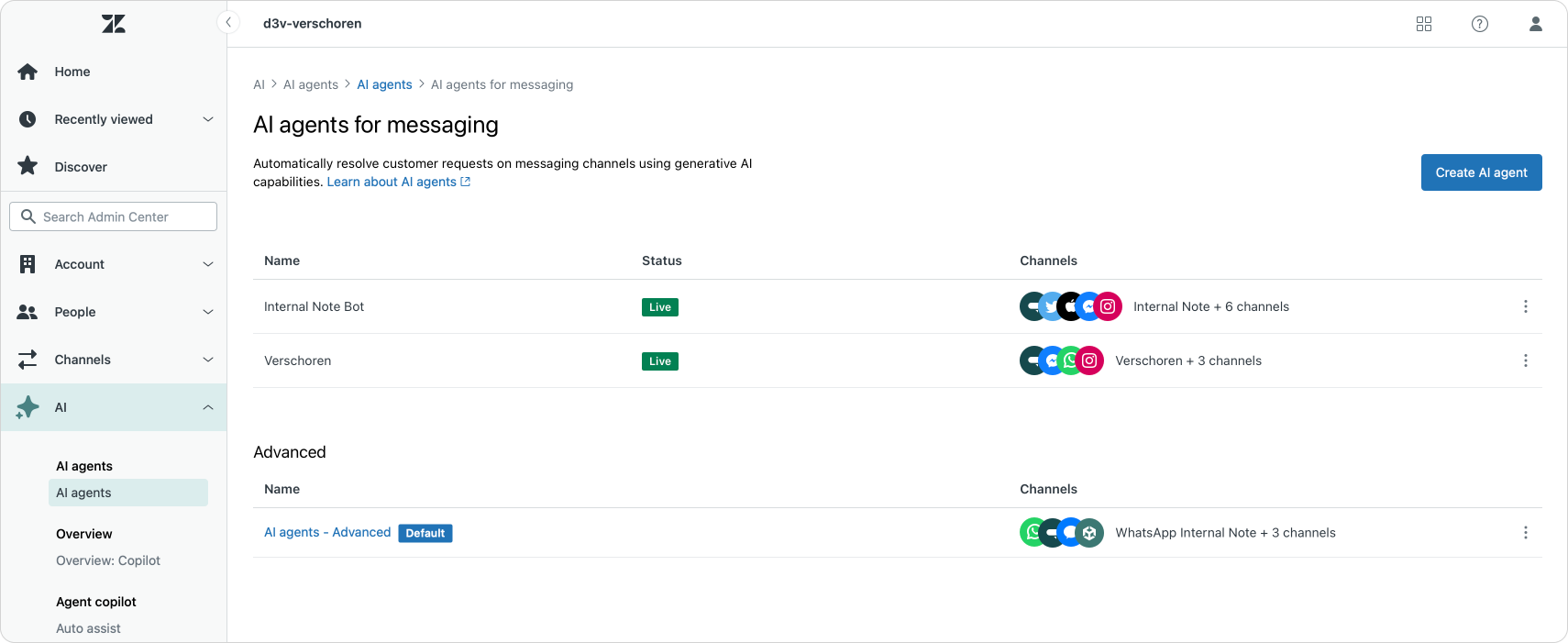 - AI Agent Essentials – Essentials bots appear under their custom names in the list. You manage them from within Zendesk, including assigning which channels they handle.