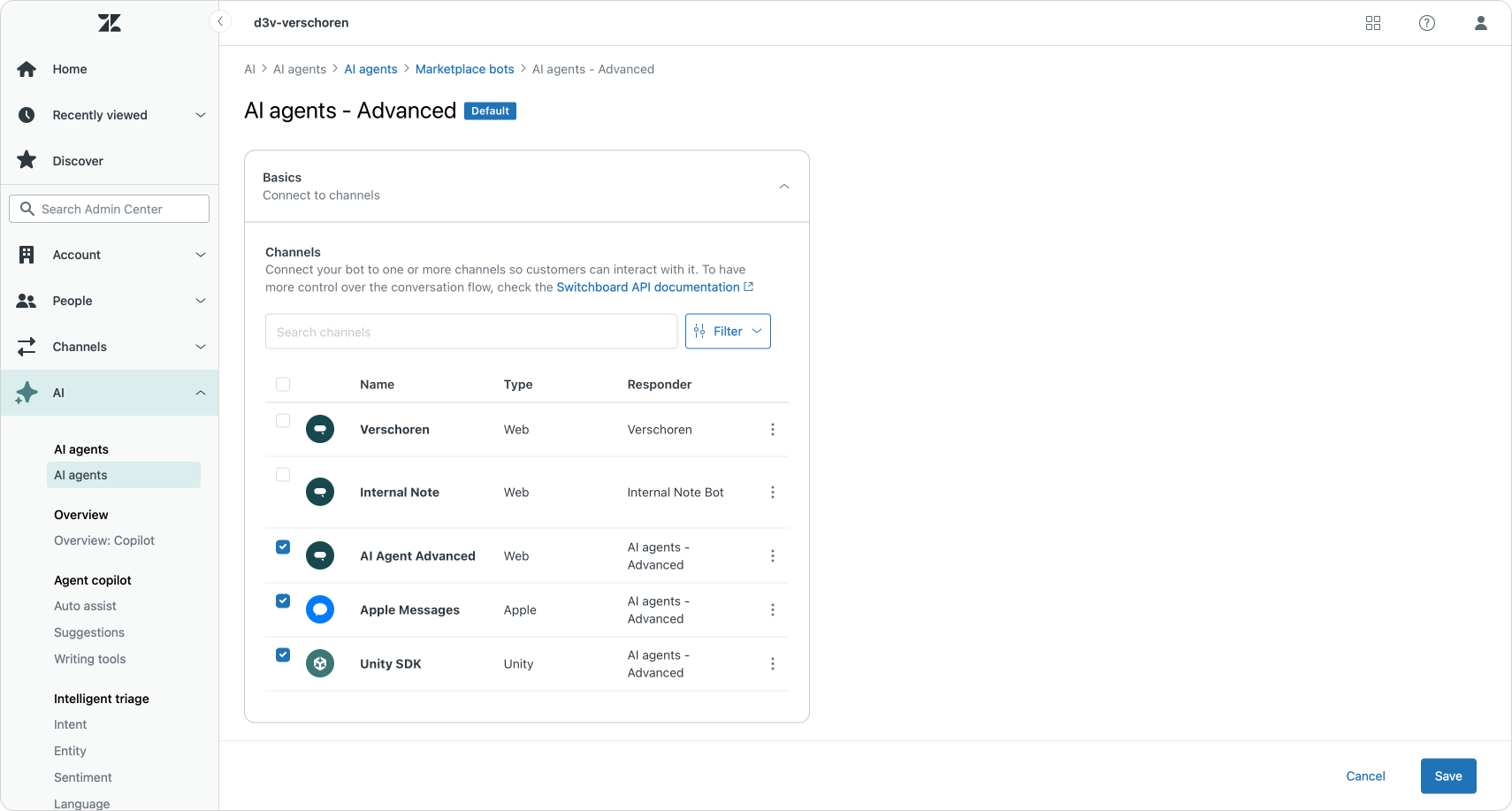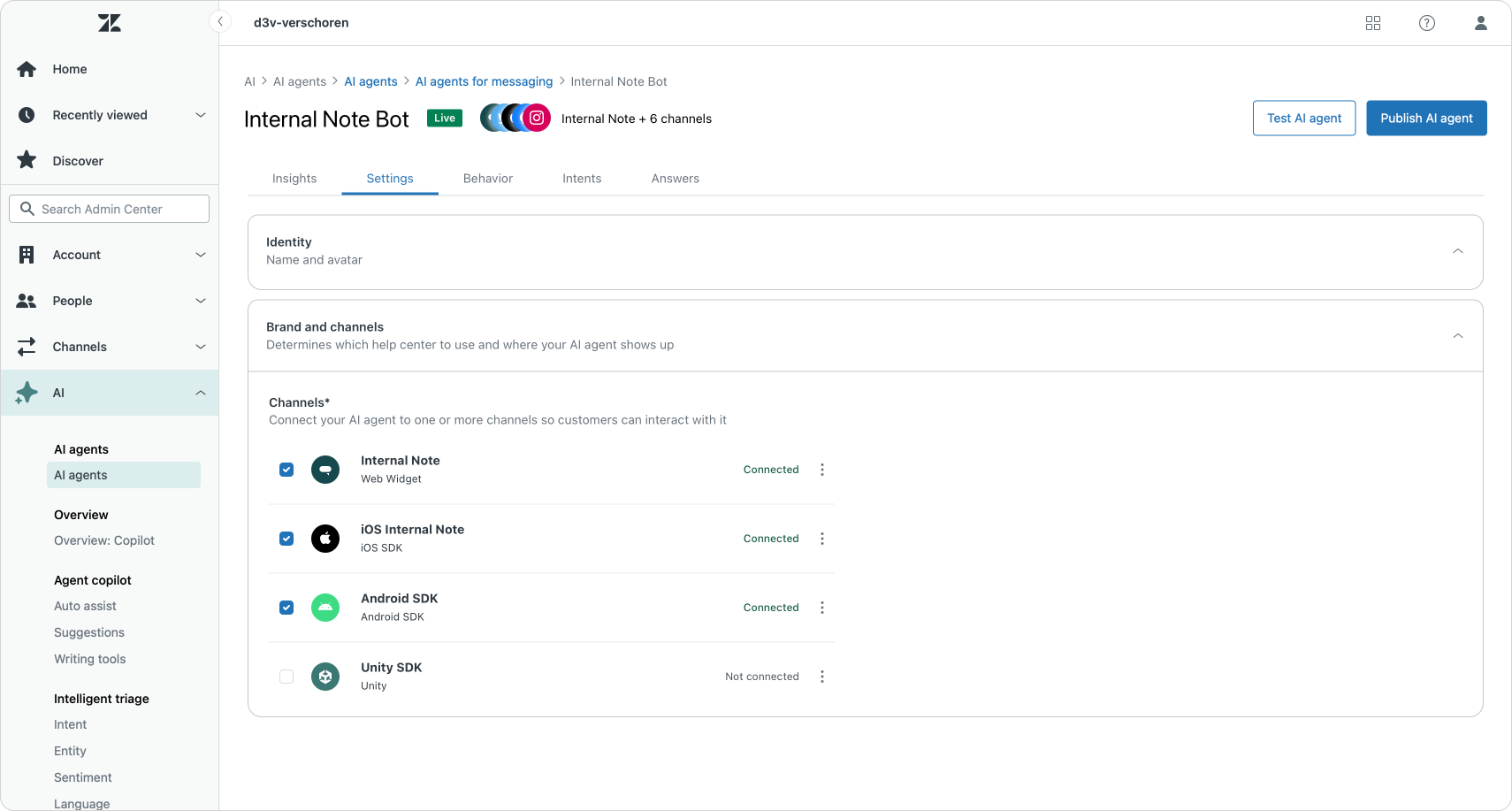- Use the AI Agent settings to assign channels to Essentials bots