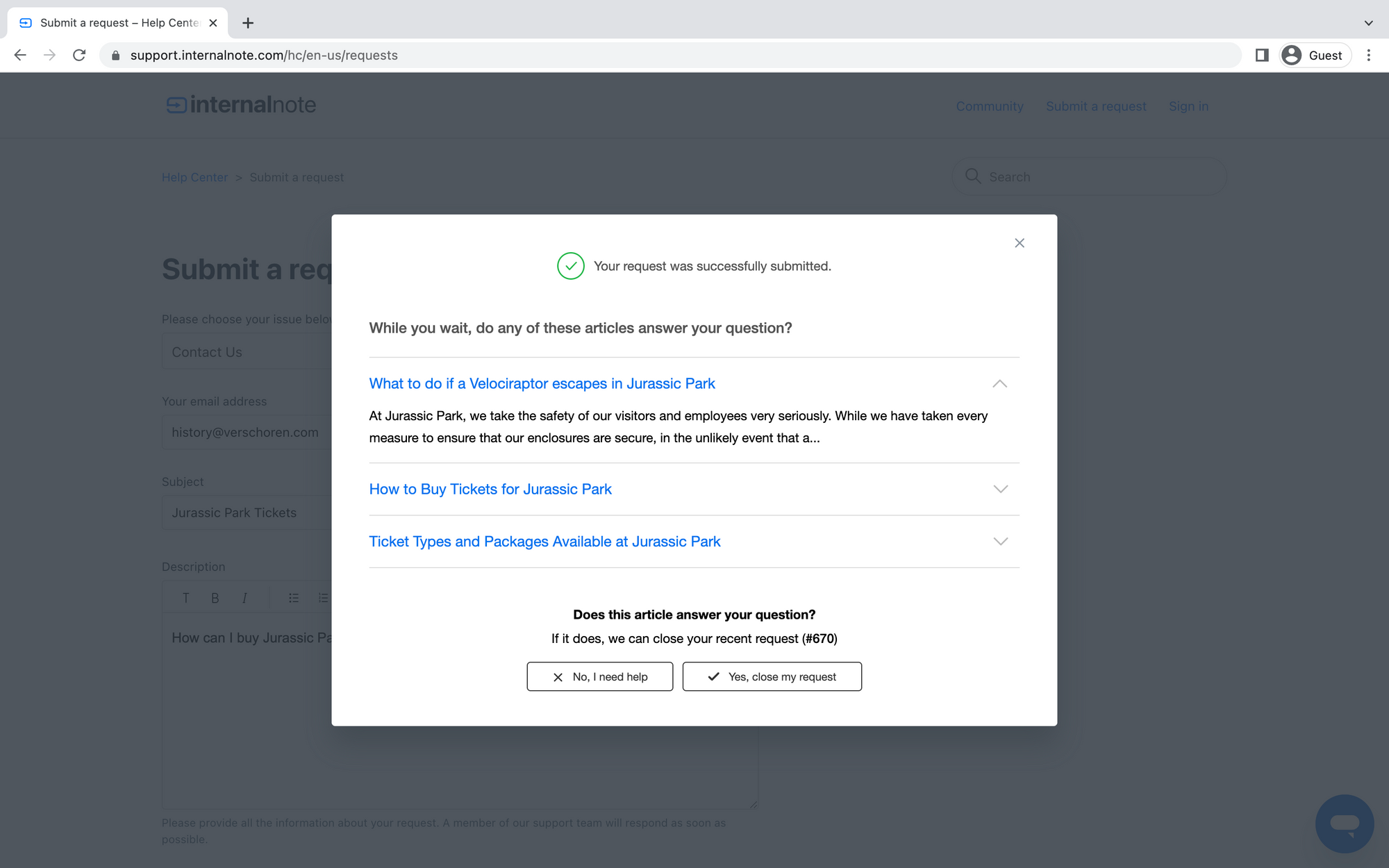You can enable a Zendesk Bot that will offer the customer articles based on their question in the Messaging widget or on social channels, or you can enable auto-replies which will respond to incoming emails by offering three Help Center articles in response to the customers' inquiry. Enabling auto-reply will also intercept webform submissions in your Help Center by presenting a modal view that shows three articles that might help.