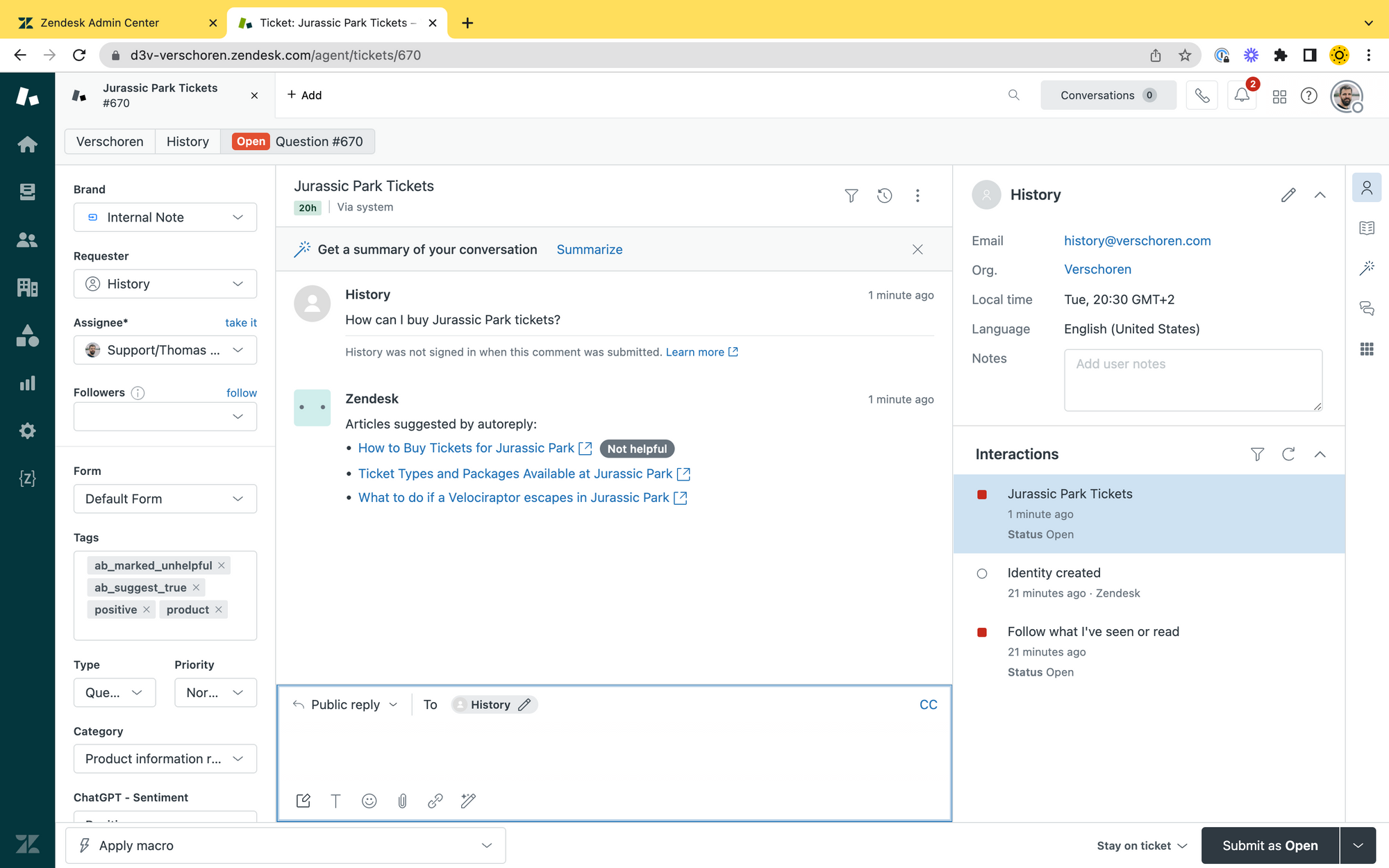If you have the Shopify integration for Zendesk enabled you can also show orders, refunds, deliveries and other interactions with your webshop right next to tickets.