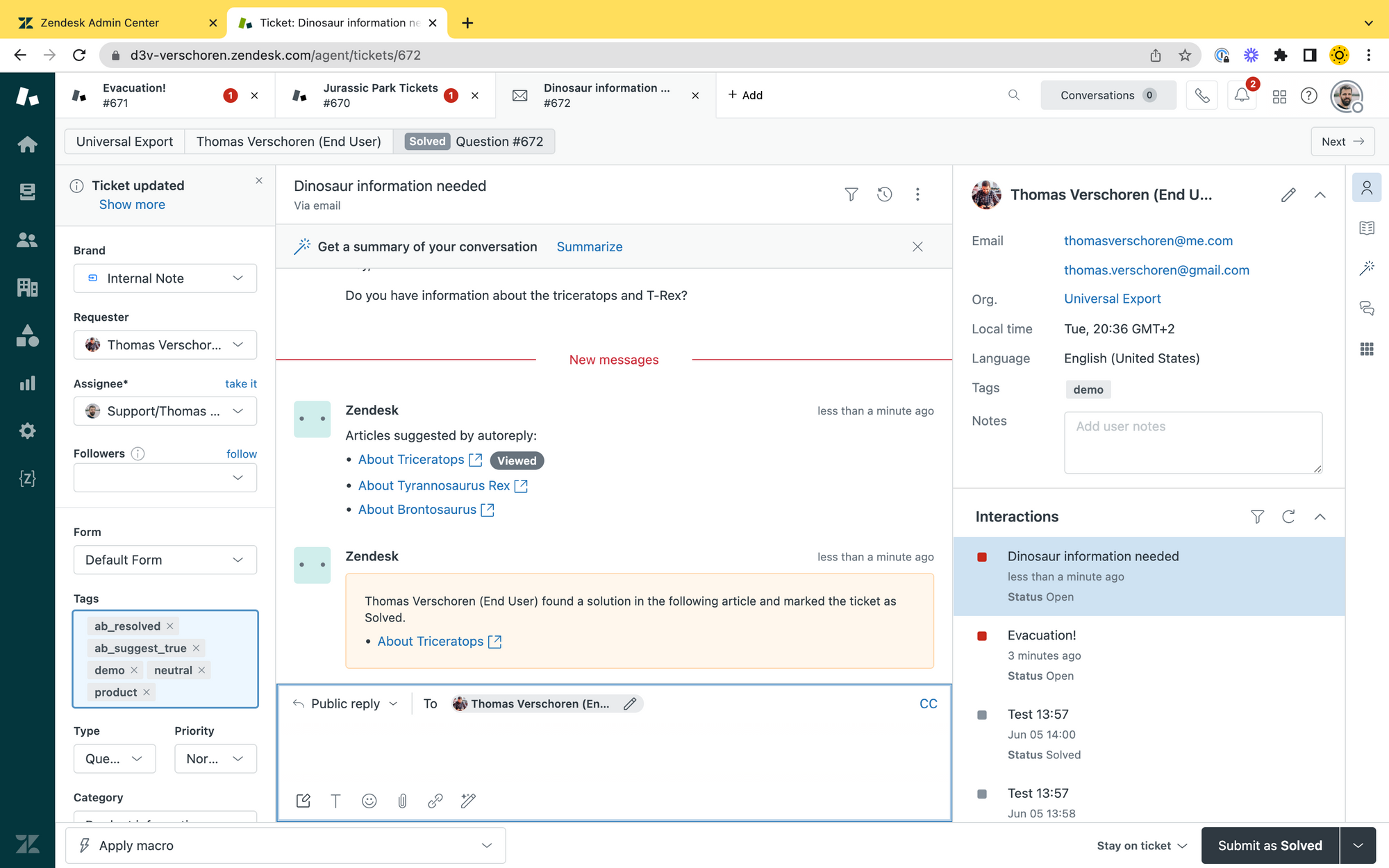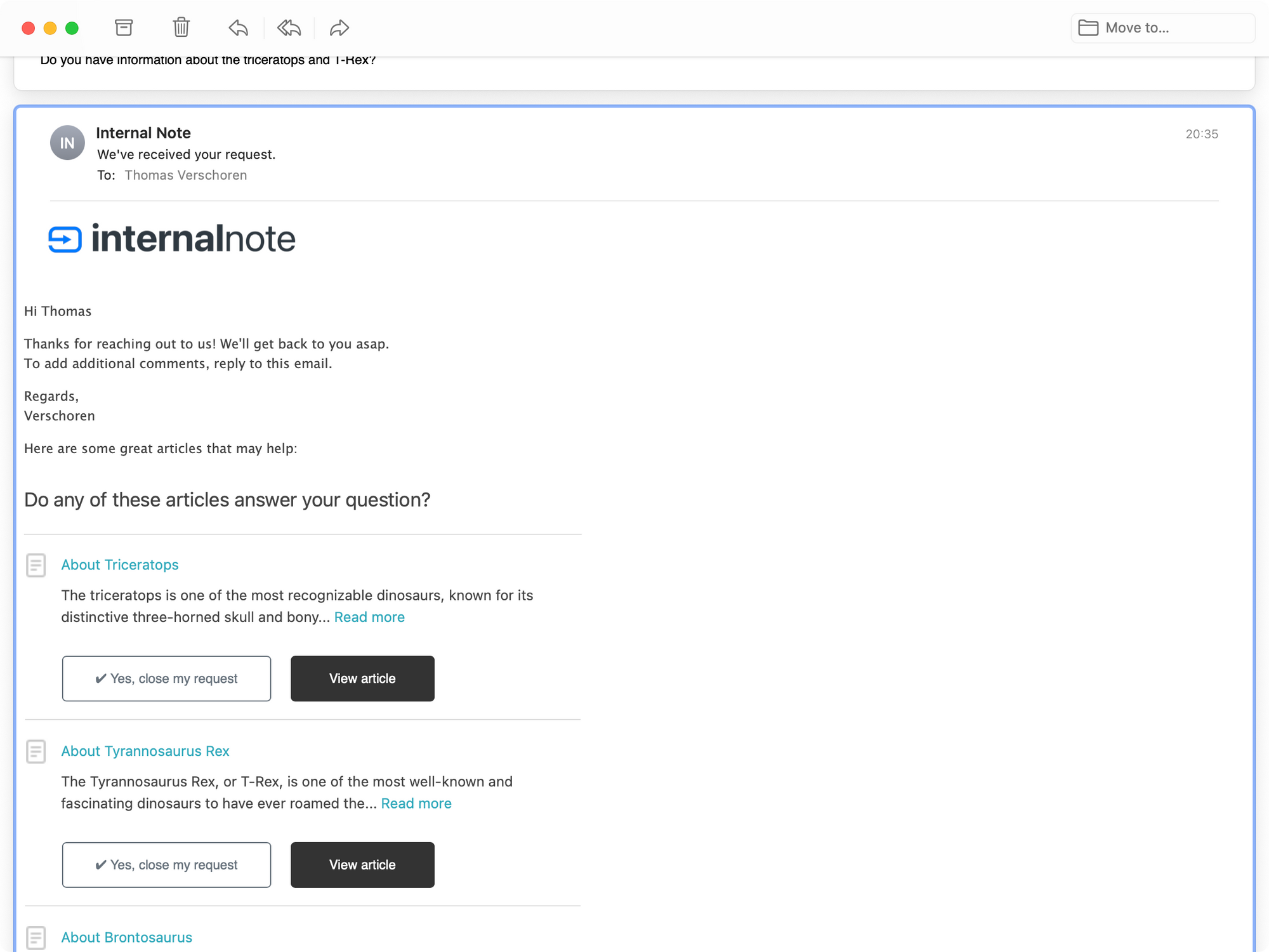 What's nice about this setup is that not only will you deflect questions that can be resolved with an article, thus giving agents time to focus on the complex questions, but Zendesk will also list the offered articles in the ticket thread. This way your agents know what's been offered to the customer already, which removes the risk of sending the same link again and again.