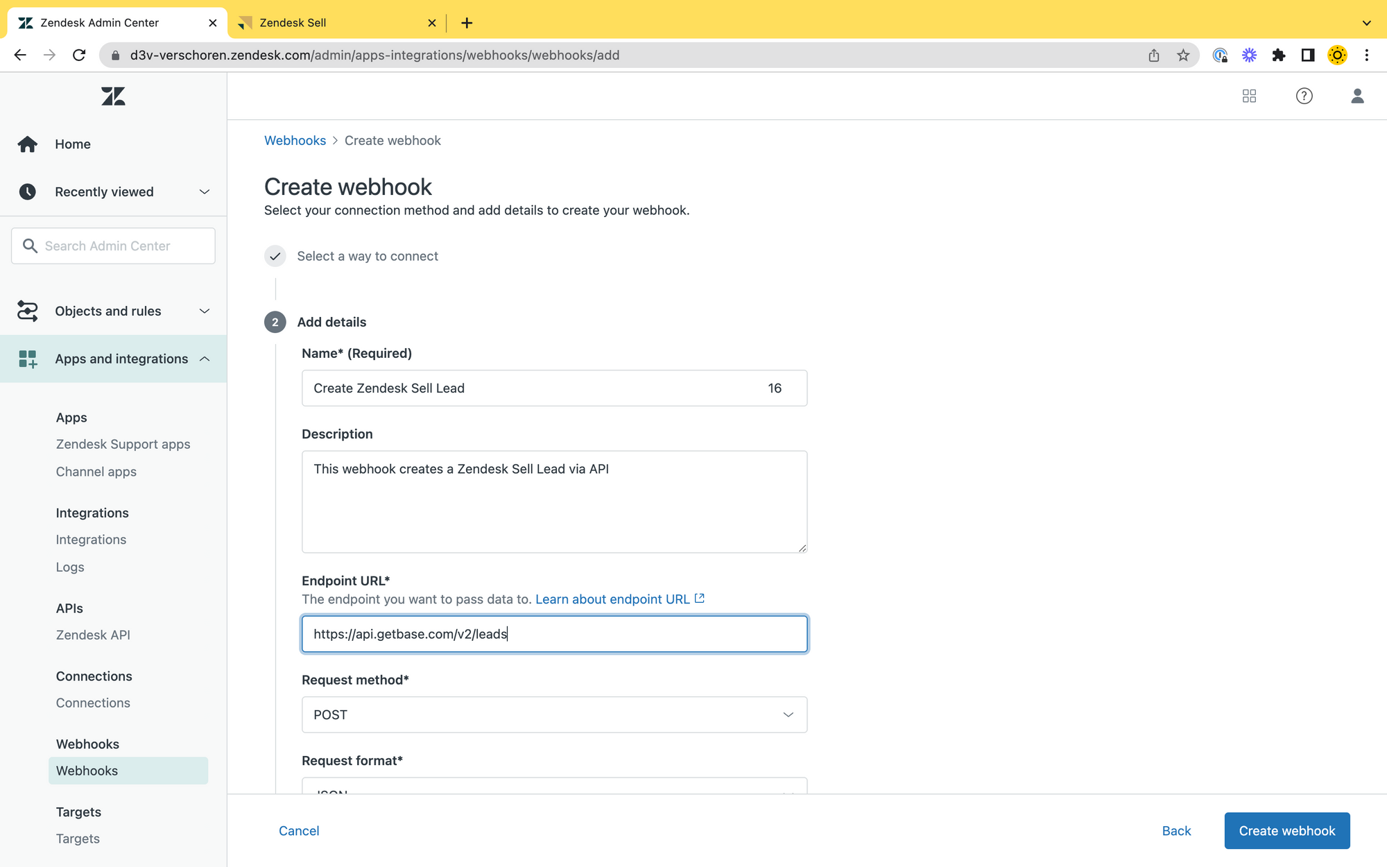 - Use webhooks to send data to Zendesk Sell, due to lack of