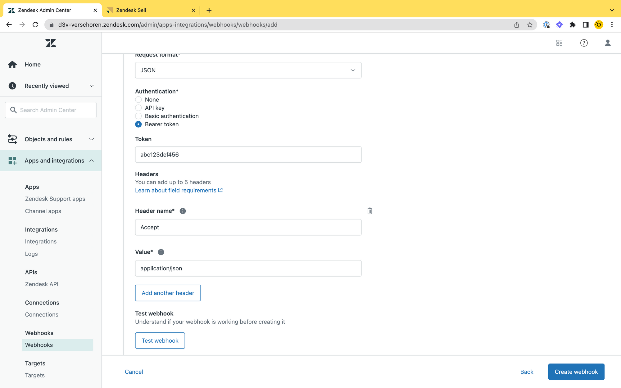 To complete the setup, add a custom header with name: accept and value: application/json and save your webhook.