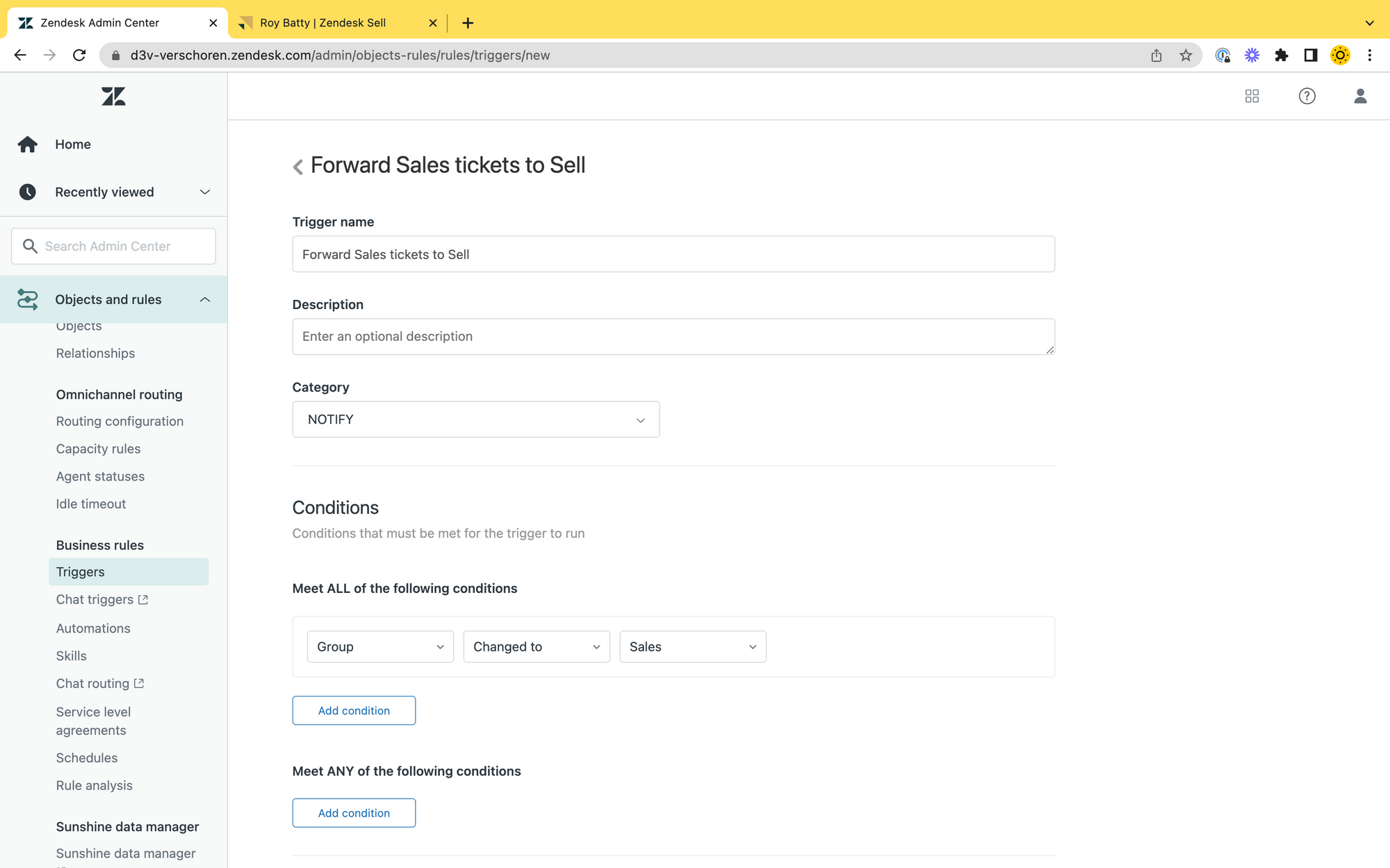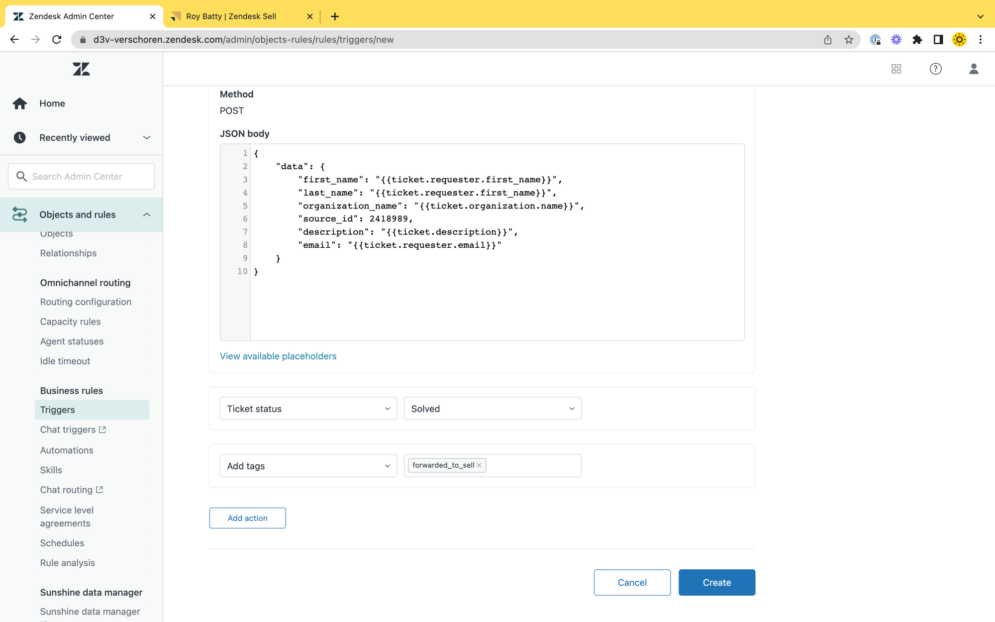 Next up, calling our Webhook. For this we'll use a trigger which, each time a ticket is assigned to Sales, will create a new Lead in Sell with the relevant information, and solve the ticket.